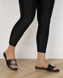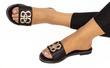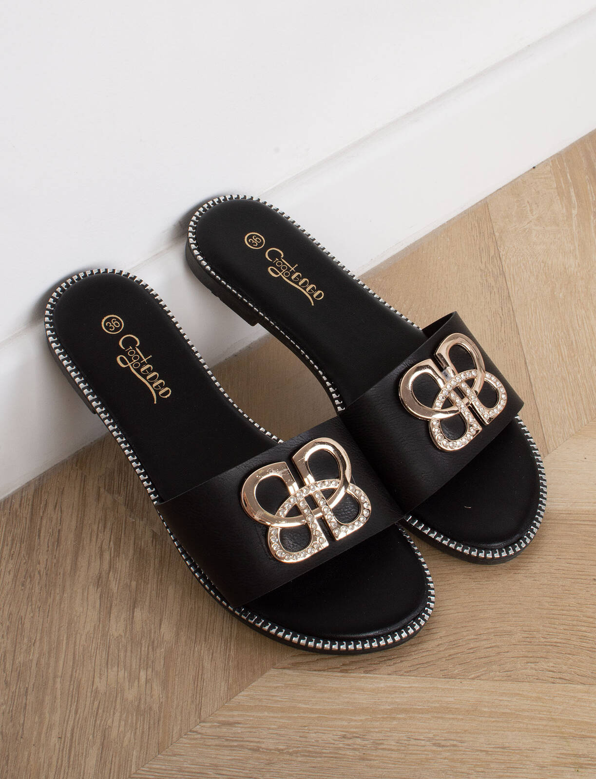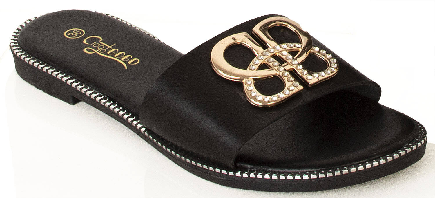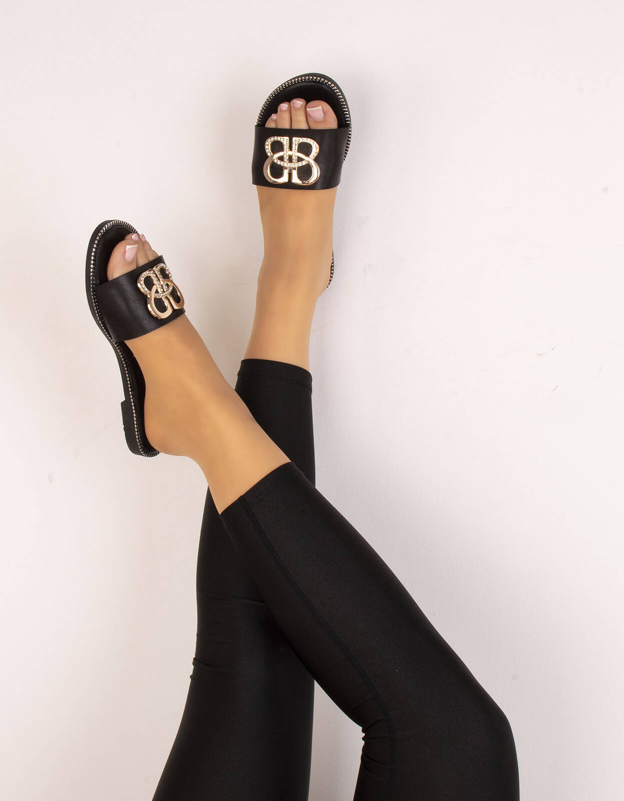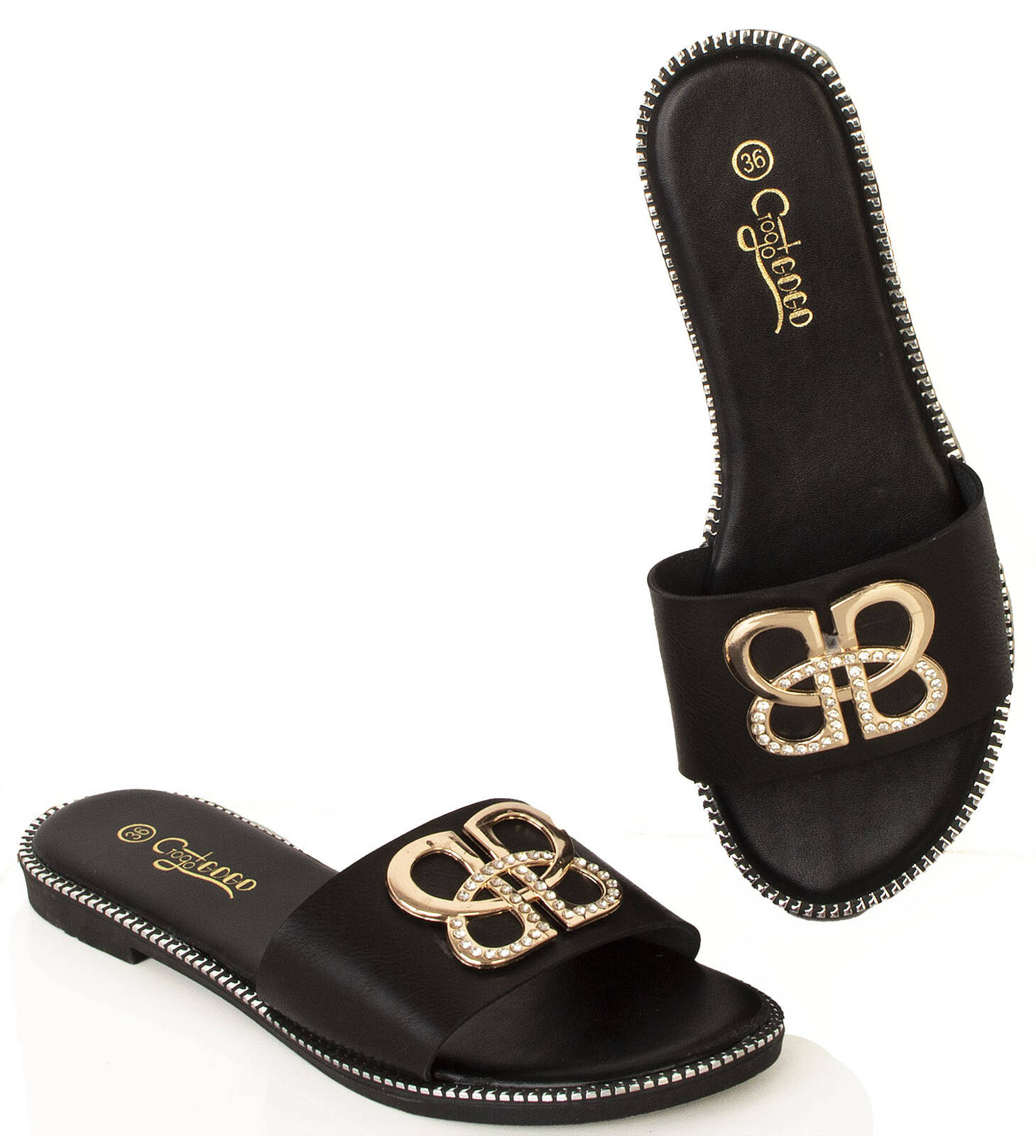 CZARNE DAMSKIE SKÓRZANE KLAPKI ELEGANCKIE OZDOBA GIMI