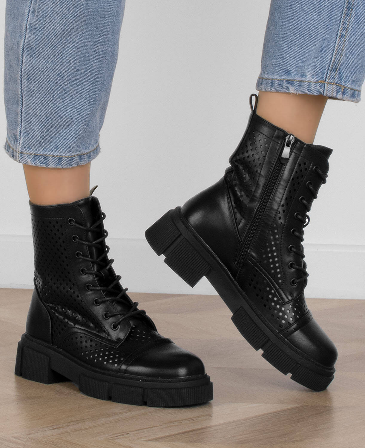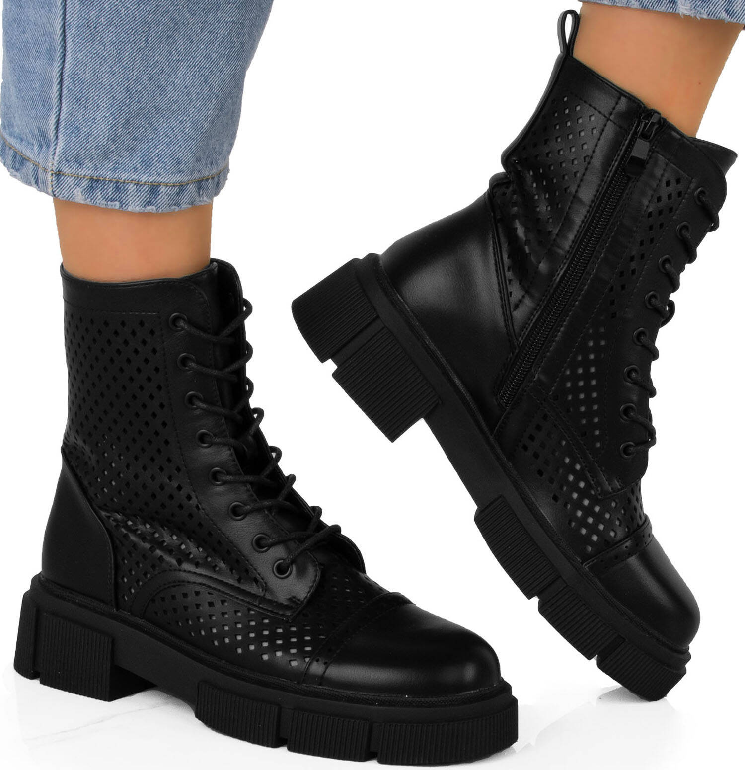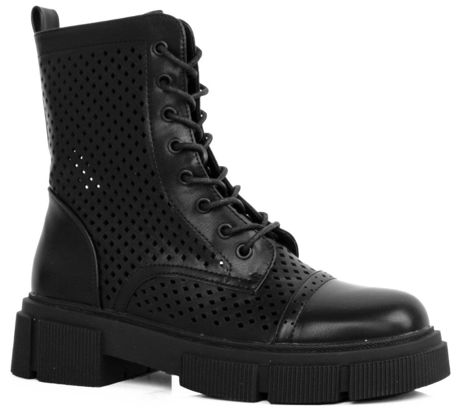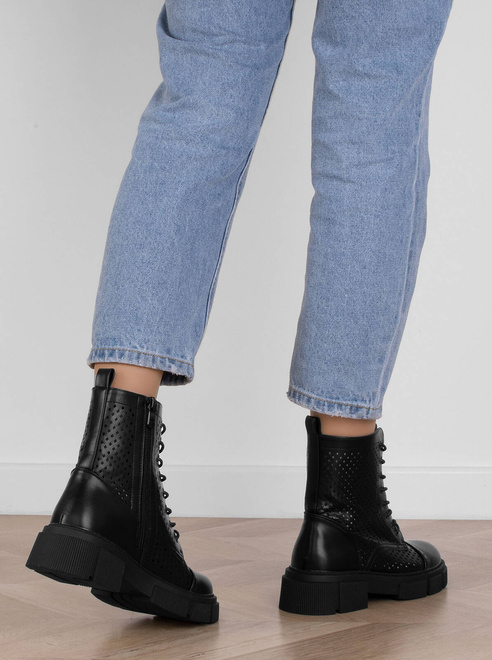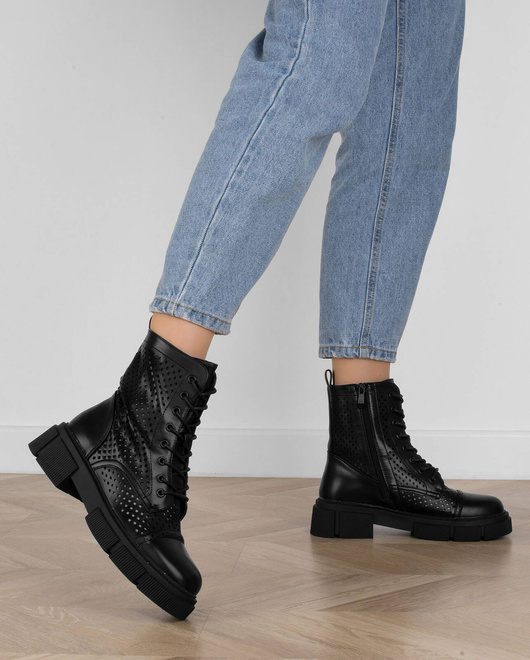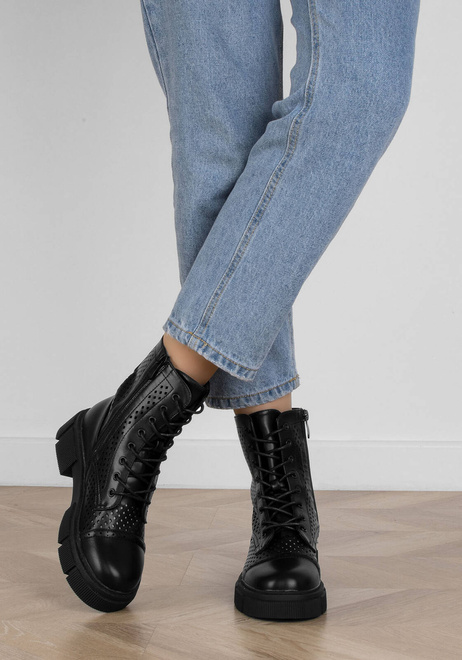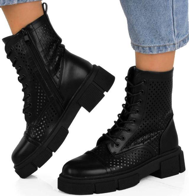 CZARNE BOTKI TRAPERY AŻUROWE SZNUROWANE ZAMEK MARGOT