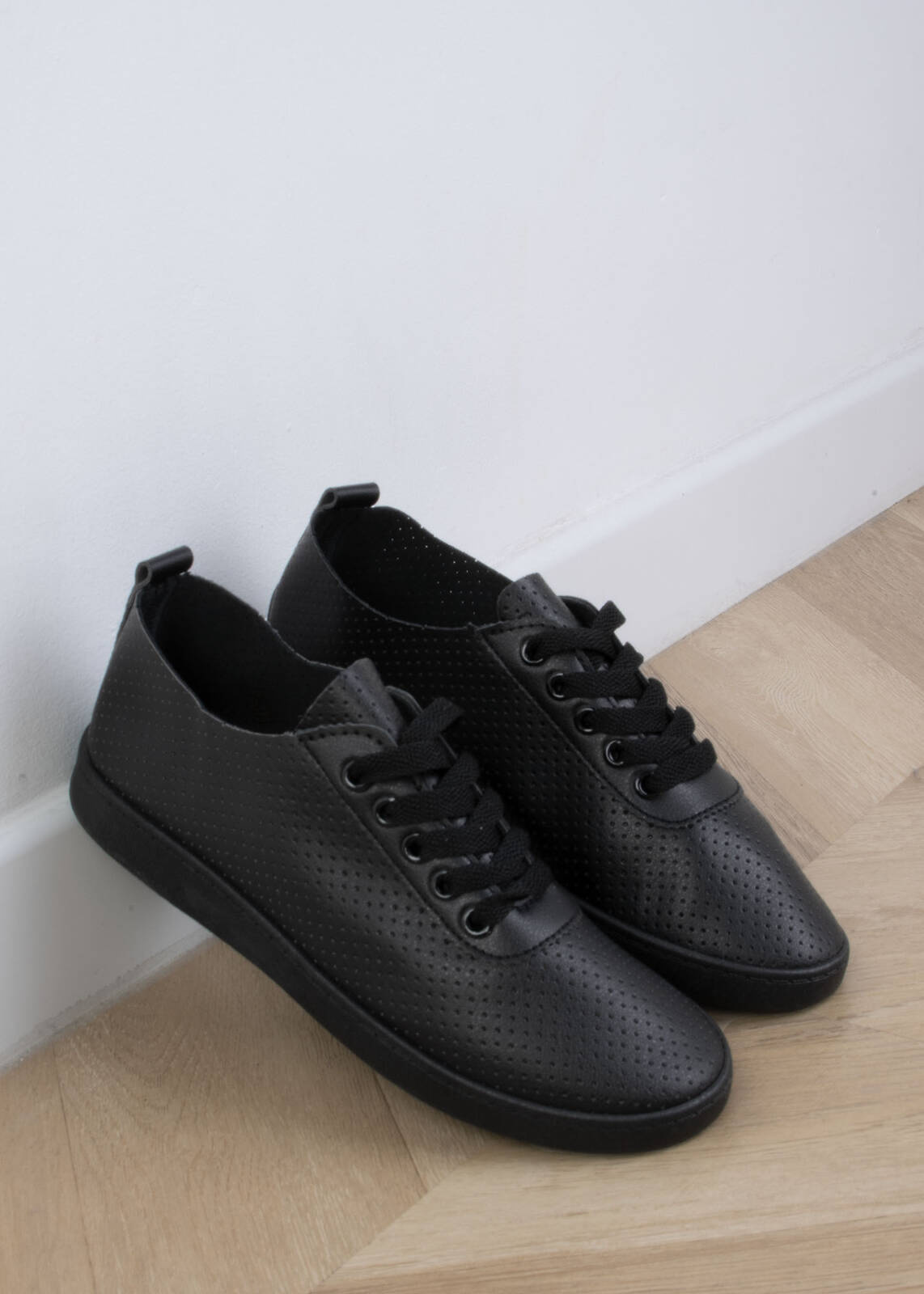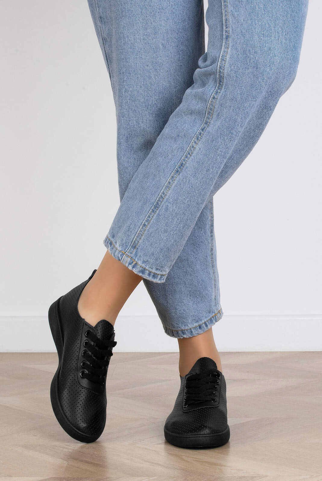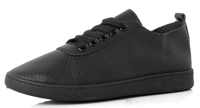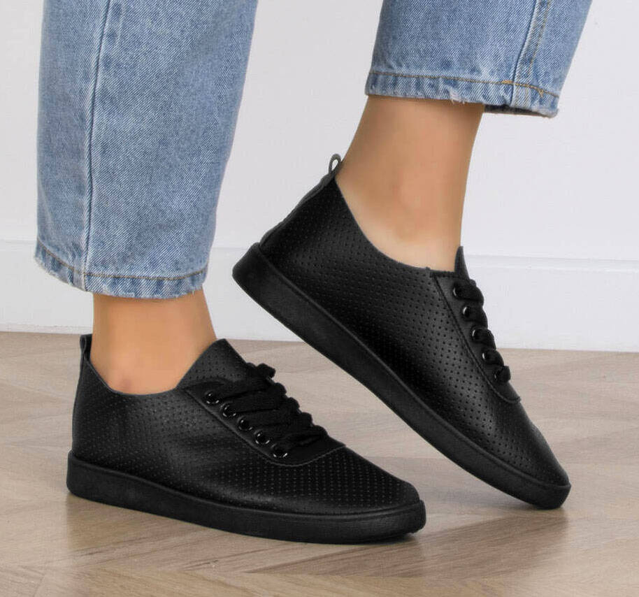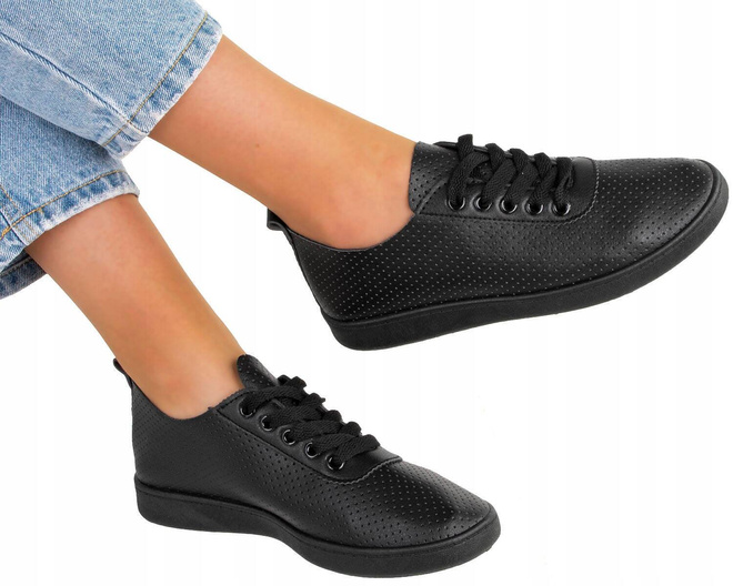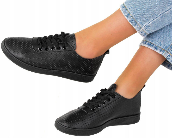 • Czarne skórzane ażurowe trampki to idealna propozycja dla wszystkich kobiet, które cenią sobie wygodę i modny wygląd. Wykonane z ekoskóry, wyposażone w ażurową cholewkę, sznurowanie, wygodną płaską gumową podeszwę i tkaninową wkładkę, zapewniają nie tylko