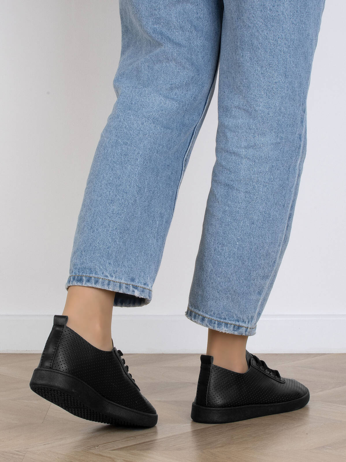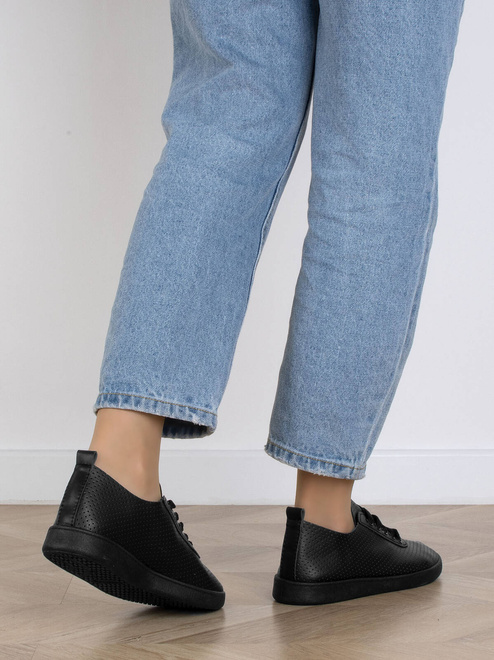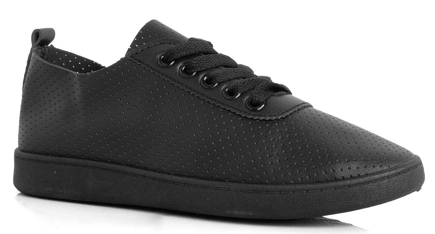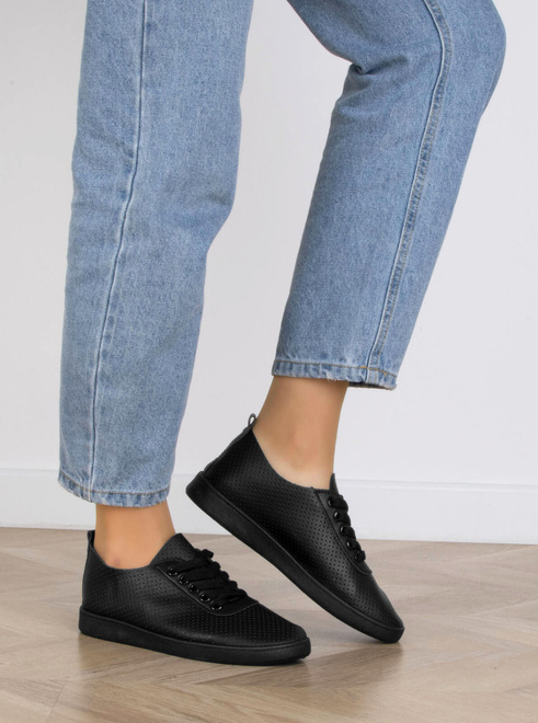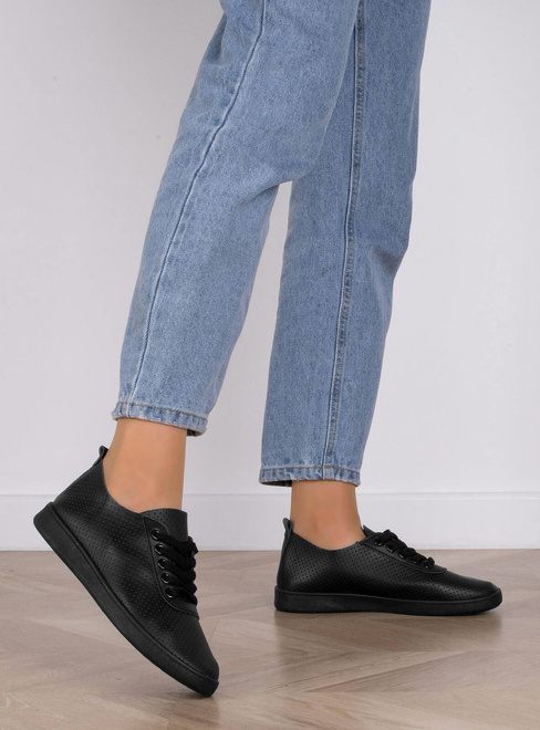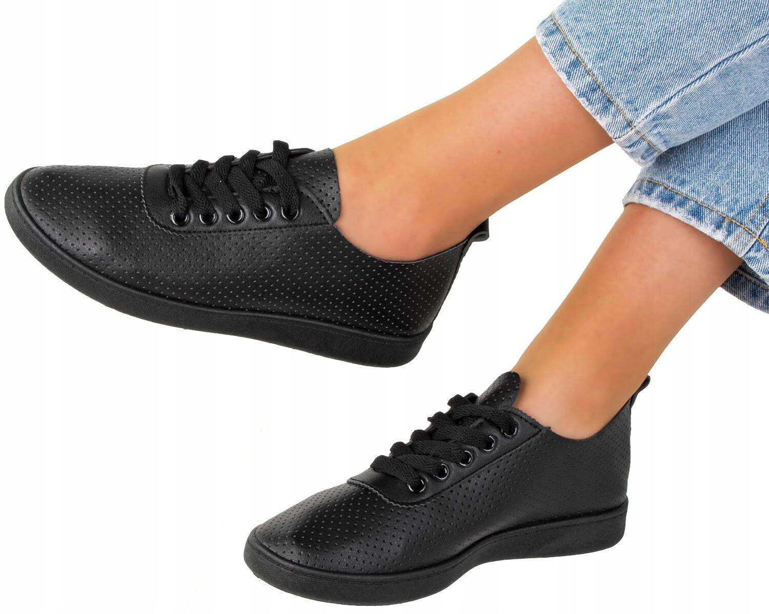 CZARNE DAMSKIE SKÓRZANE AŻUROWE TRAMPKI TENISÓWKI FLORA
