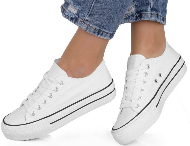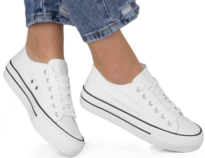 Białe trampki z grubą podeszwą to połączenie stylu i wygody, idealne na każdą okazję. Ich nowoczesny design i charakterystyczna podeszwa nadają im dynamicznego wyglądu, który wyróżni Cię z tłumu. Trampki te wykonane są z wysokiej jakości materiałów, co gwarantuje trwałość i komfort noszenia. Gruba podeszwa zapewnia doskonałą amortyzację i stabilność kroku, nawet podczas długich spacerów czy aktywności na świeżym powietrzu. Białe trampki z grubą podeszwą to wszechstronny element garderoby, który doskonale komponuje się zarówno z casualowymi, jak i sportowymi stylizacjami. Idealne na spacer po mieście, spotkanie ze znajomymi czy weekendowe wyjścia.