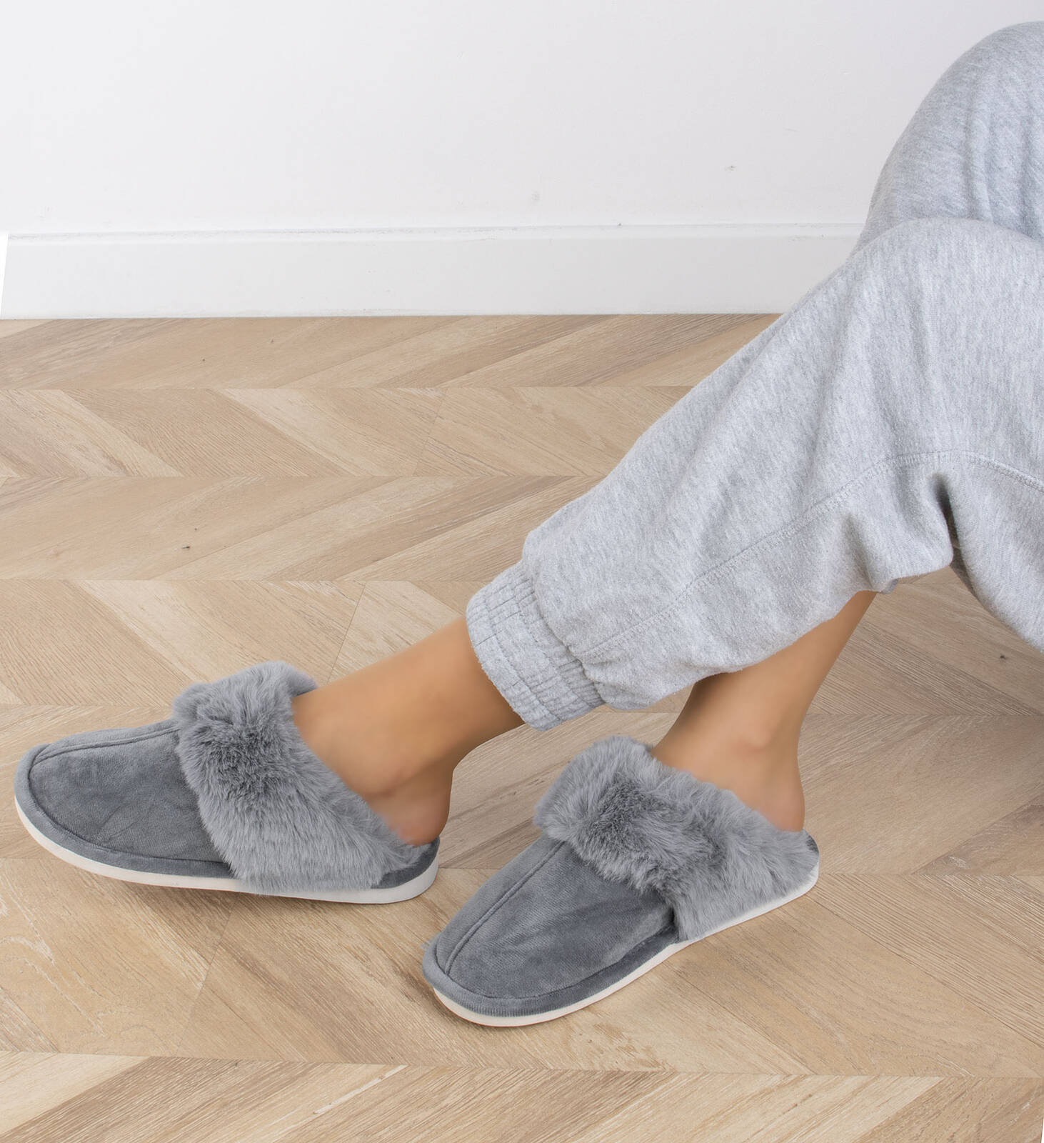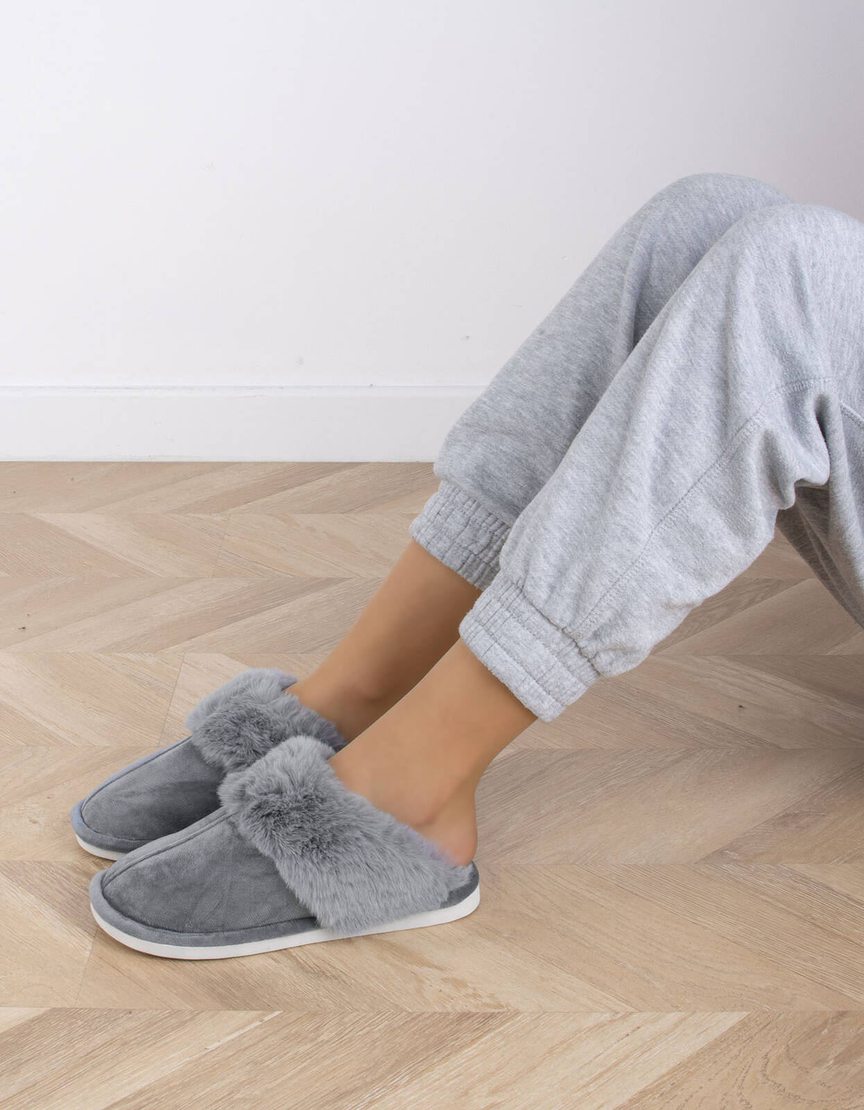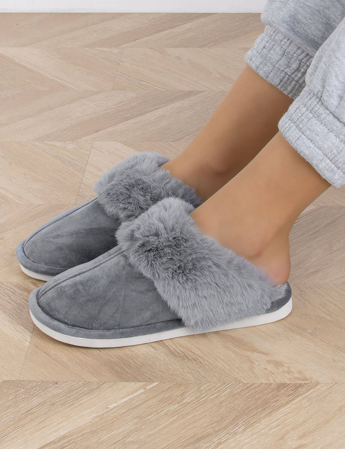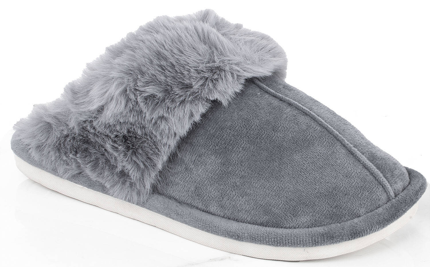 Damskie, wygodne klapki na płaskiej podeszwie. Ocieplane futerkiem. Idealne jako kapcie po domu w zimne wieczory!
