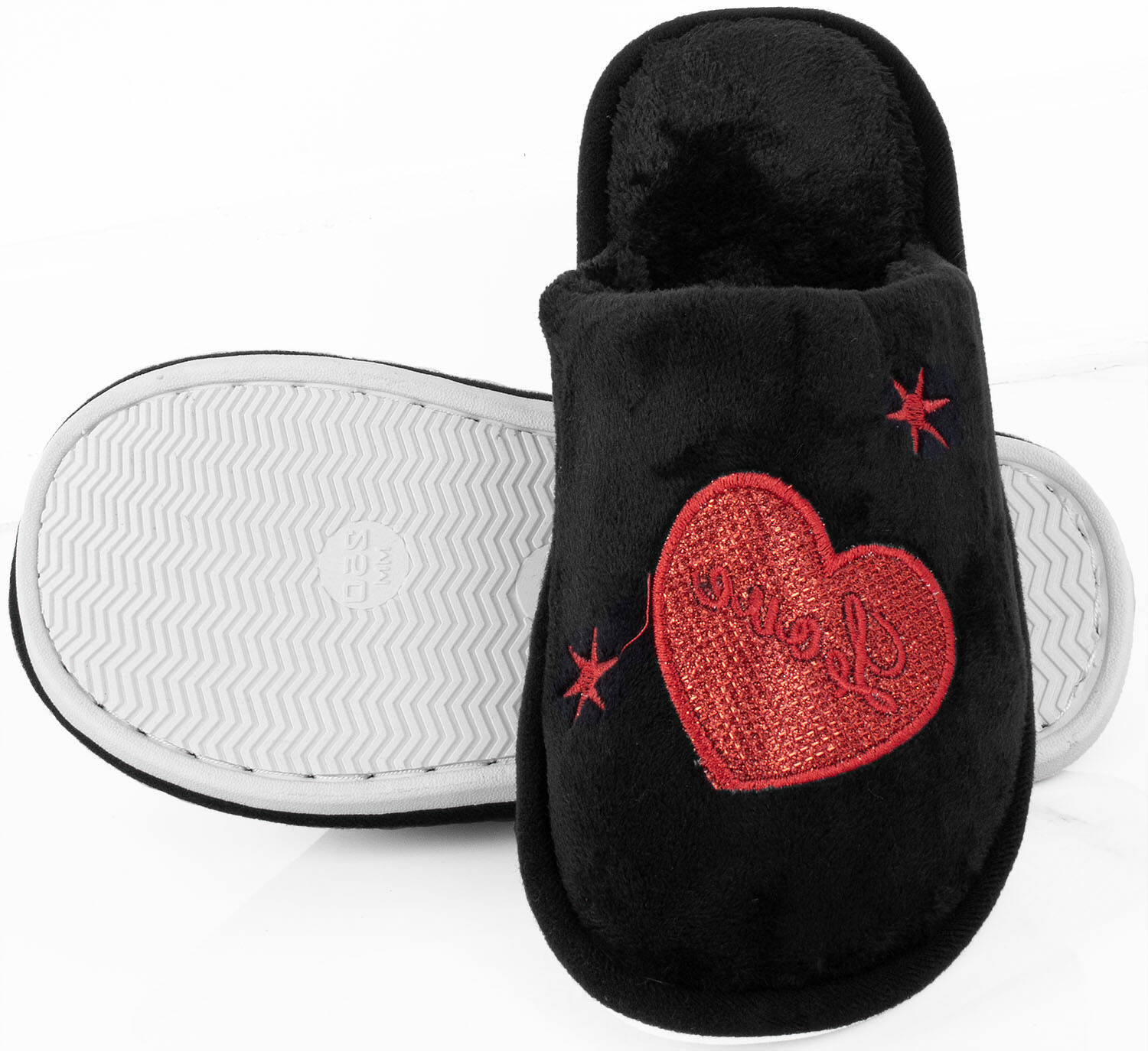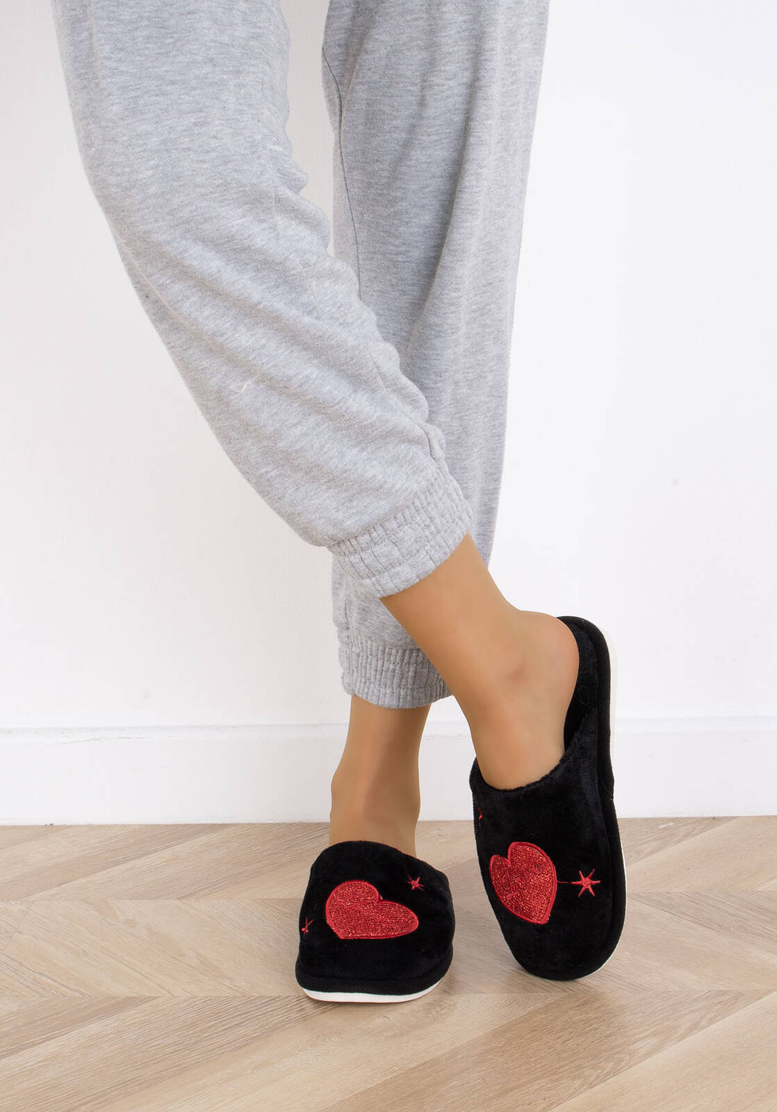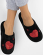 Damskie, wygodne klapki na płaskiej podeszwie, ze wzorem serca. Idealne jako kapcie po domu w zimne wieczory! Dostępne rozmiary: 36/37, 38/39, 40/41