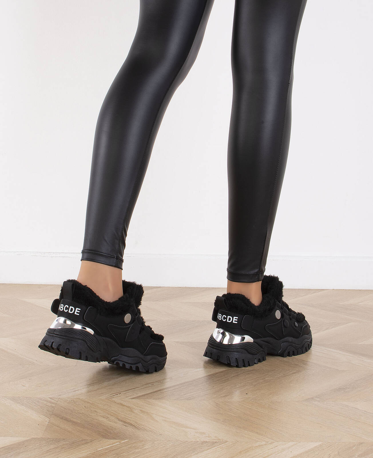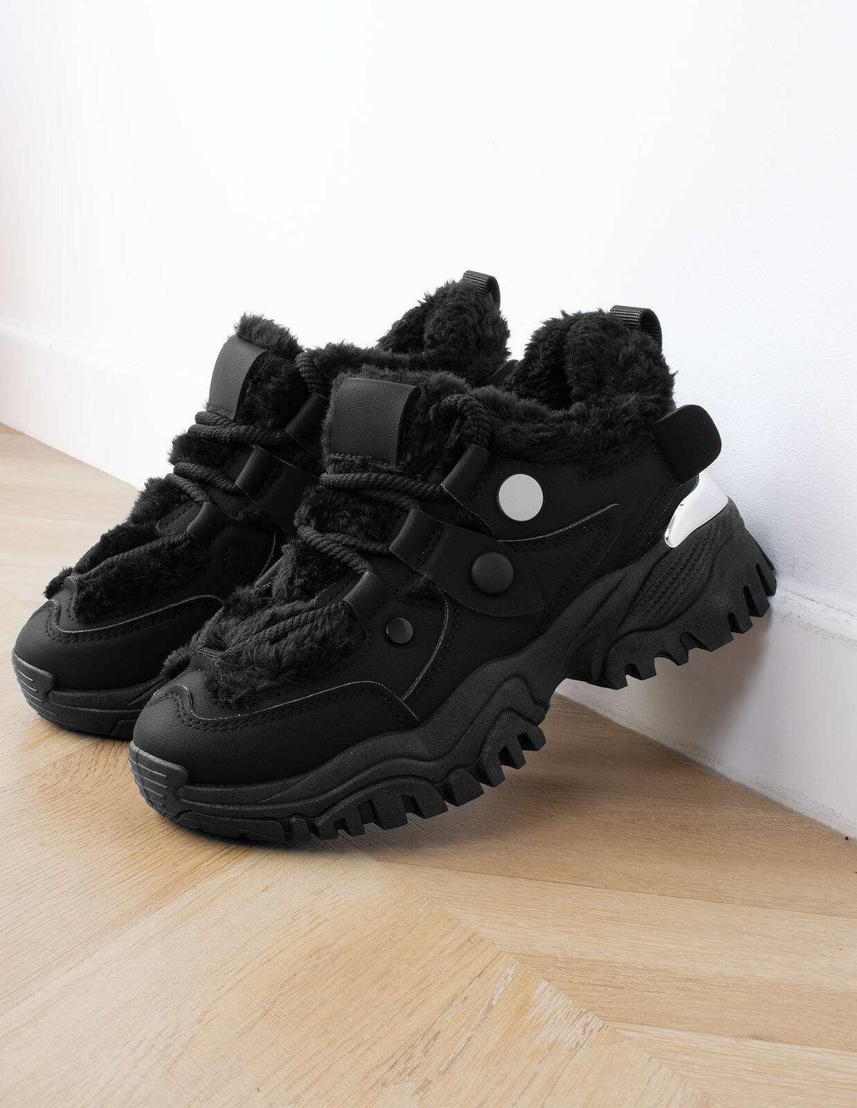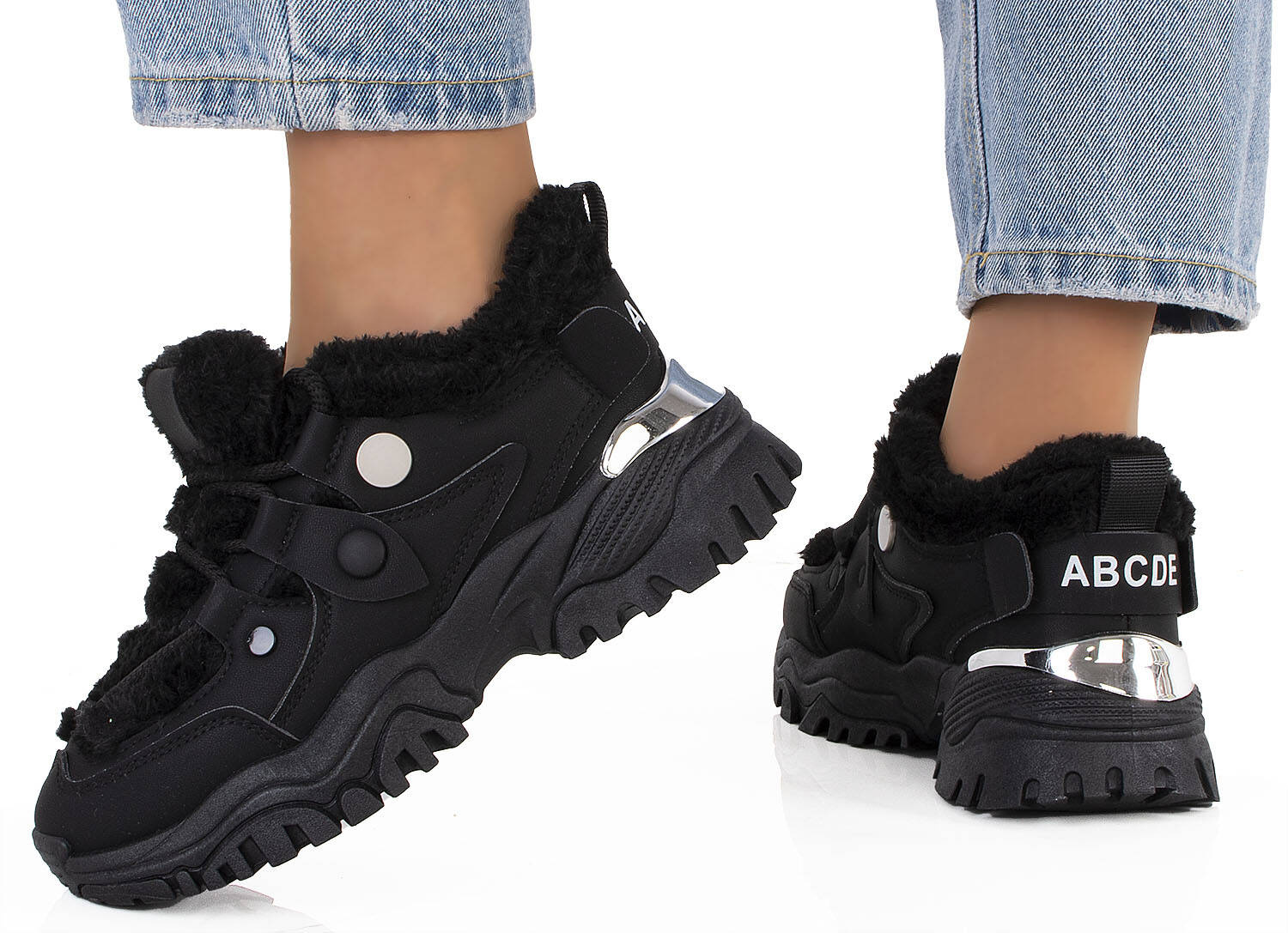 Czarne ocieplane sneakersy botki na platformie, sznurowane, idealne na chłodniejsze dni, łączące w sobie sportowy styl z wygodą.