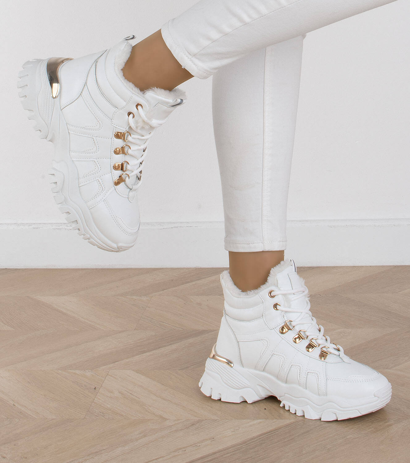 Białe ocieplane sneakersy botki na platformie, sznurowane, idealne na chłodniejsze dni, łączące w sobie sportowy styl z wygodą.