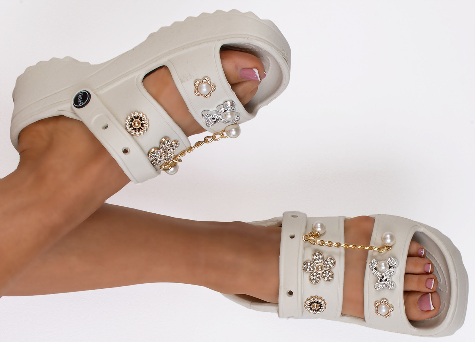 Paski z ozdobami dodają butom charakteru i stylowego wyglądu, jednocześnie zapewniając dodatkową trwałość i wygodę. To sprawia, że są one nie tylko praktycznym, ale również modnym dodatkiem do letnich stylizacji.