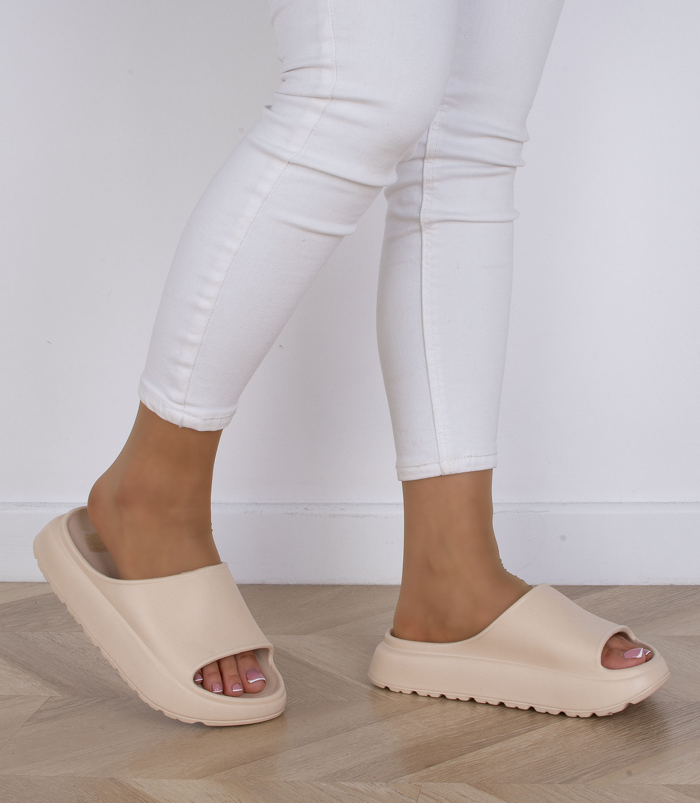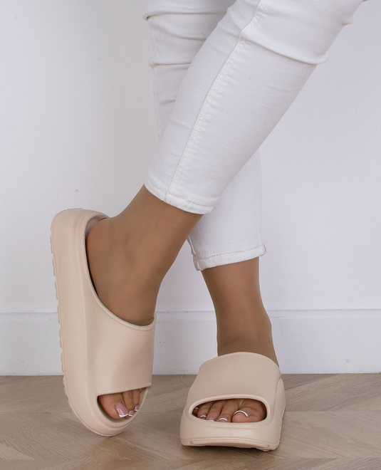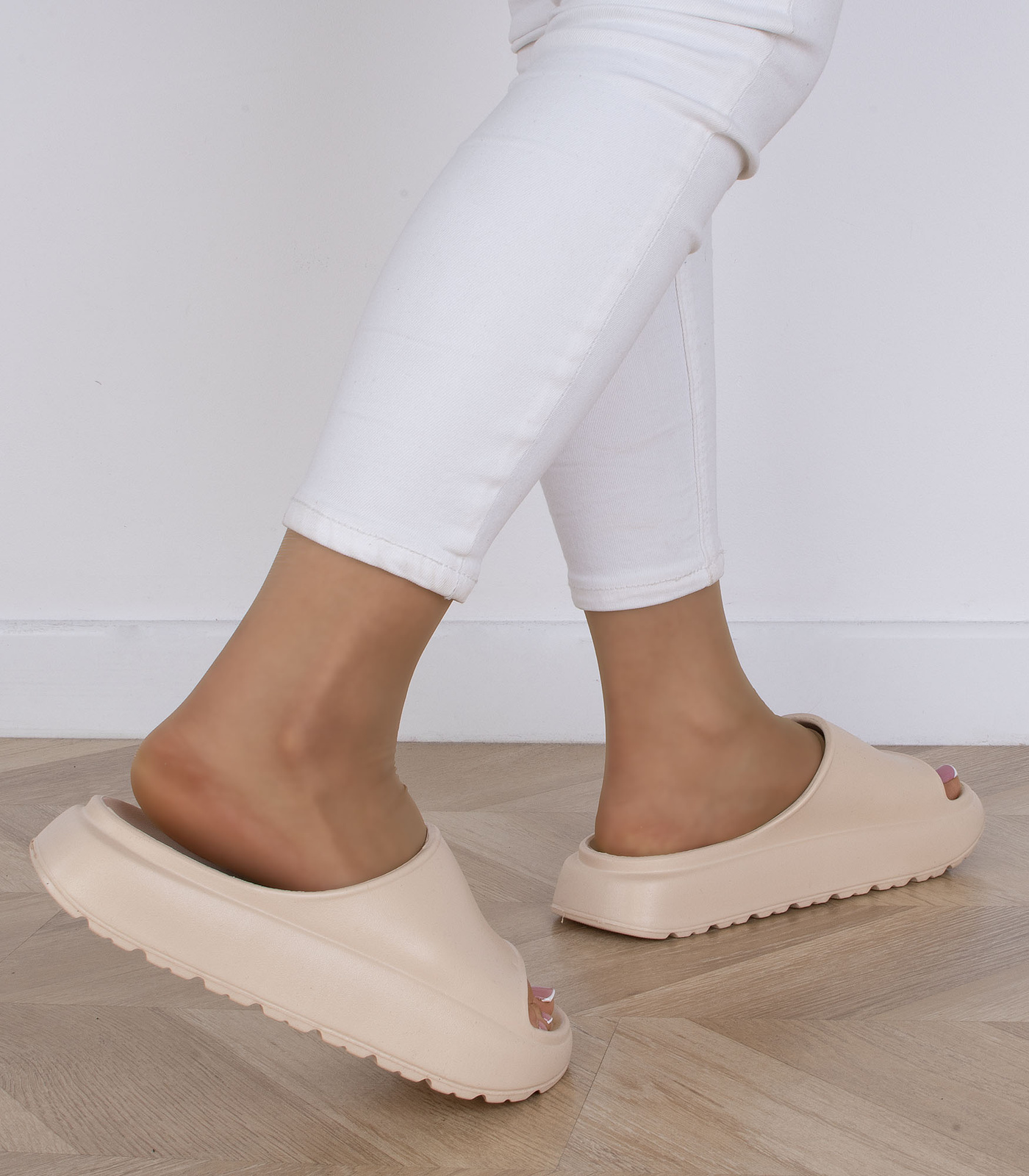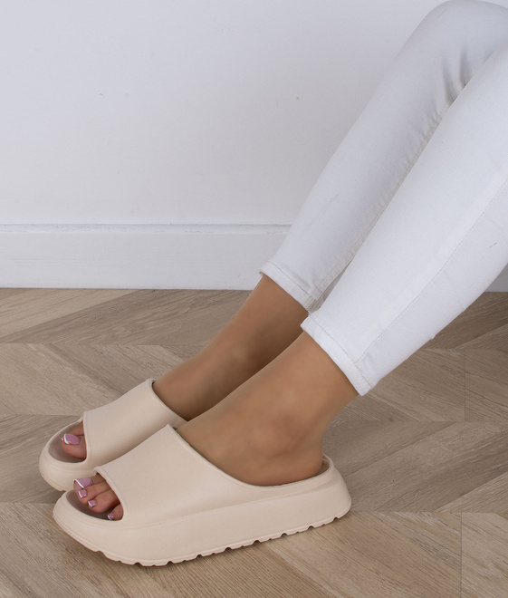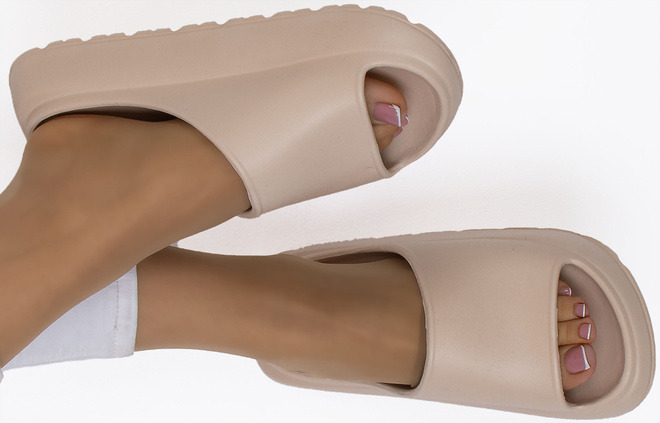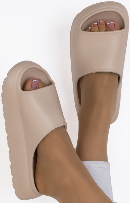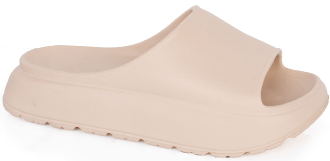 Beżowe gumowe klapki to idealne obuwie na lato, które łączy w sobie wygodę i funkcjonalność. Ich kolor sprawia, że pasują do wielu różnych stylizacji, zarówno na plażę, jak i na spacer po mieście czy basen.