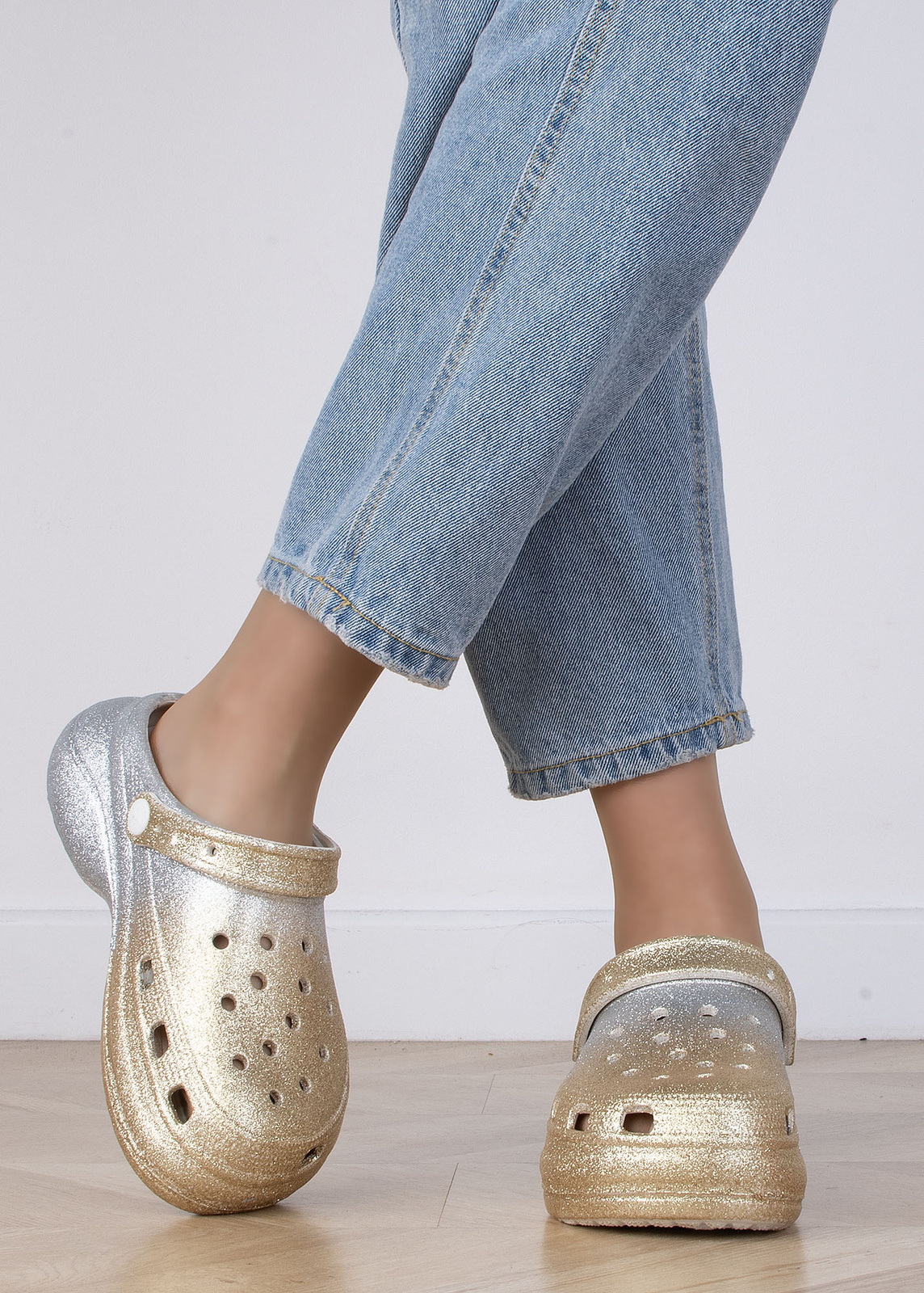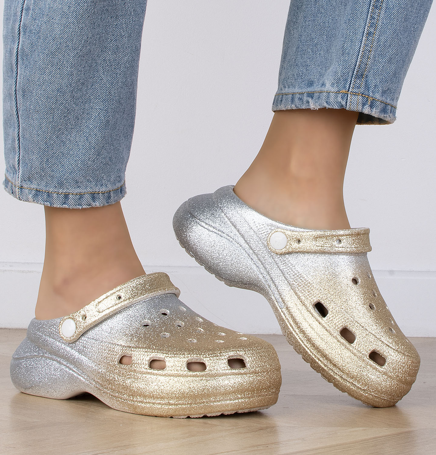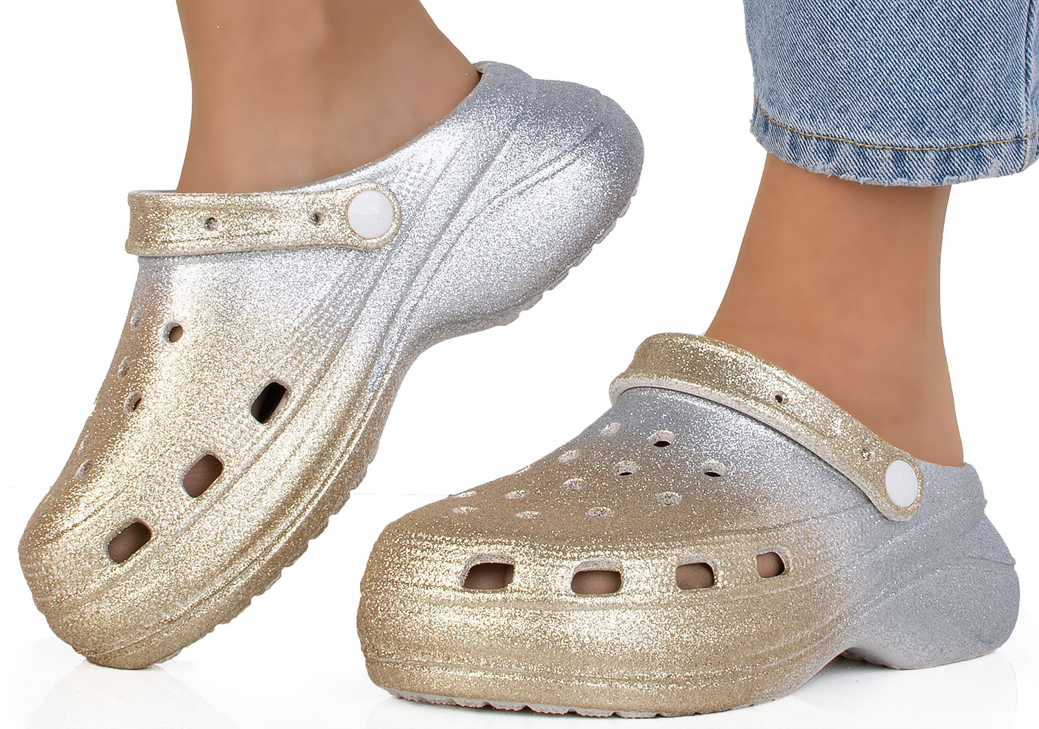 ZŁOTE BROKATOWE DAMSKIE PIANKOWE KLAPKI NA GRUBEJ PODESZWIE CITRA