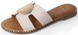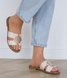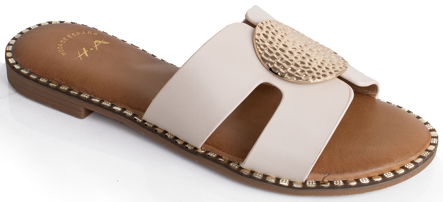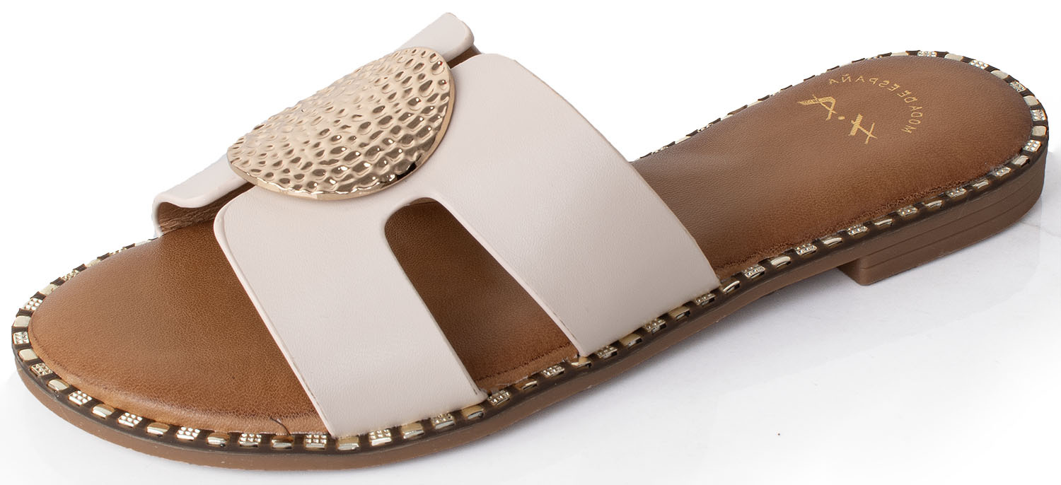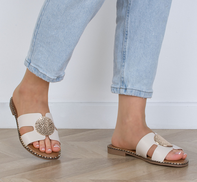 BEŻOWE DAMSKIE SKÓRZANE KLAPKI ELEGANCKIE OZDOBA NICKIE