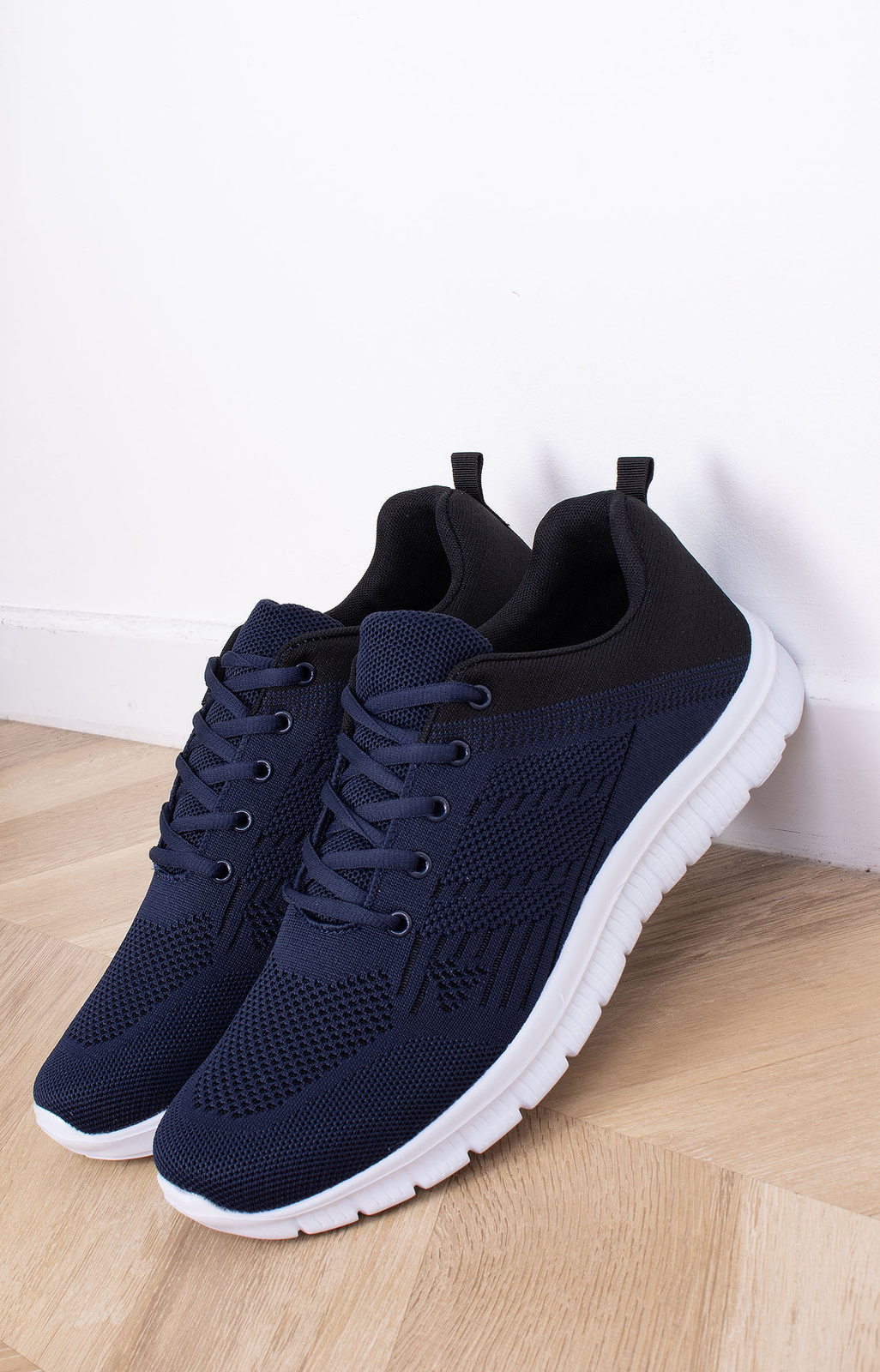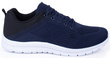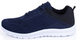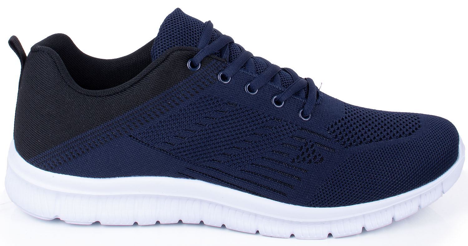 Męskie buty sportowe wykonane z materiału tkaninowego w kolorze granatowym. Obuwie sznurowane, lekka sportowa podeszwa, idealne na wiosnę.