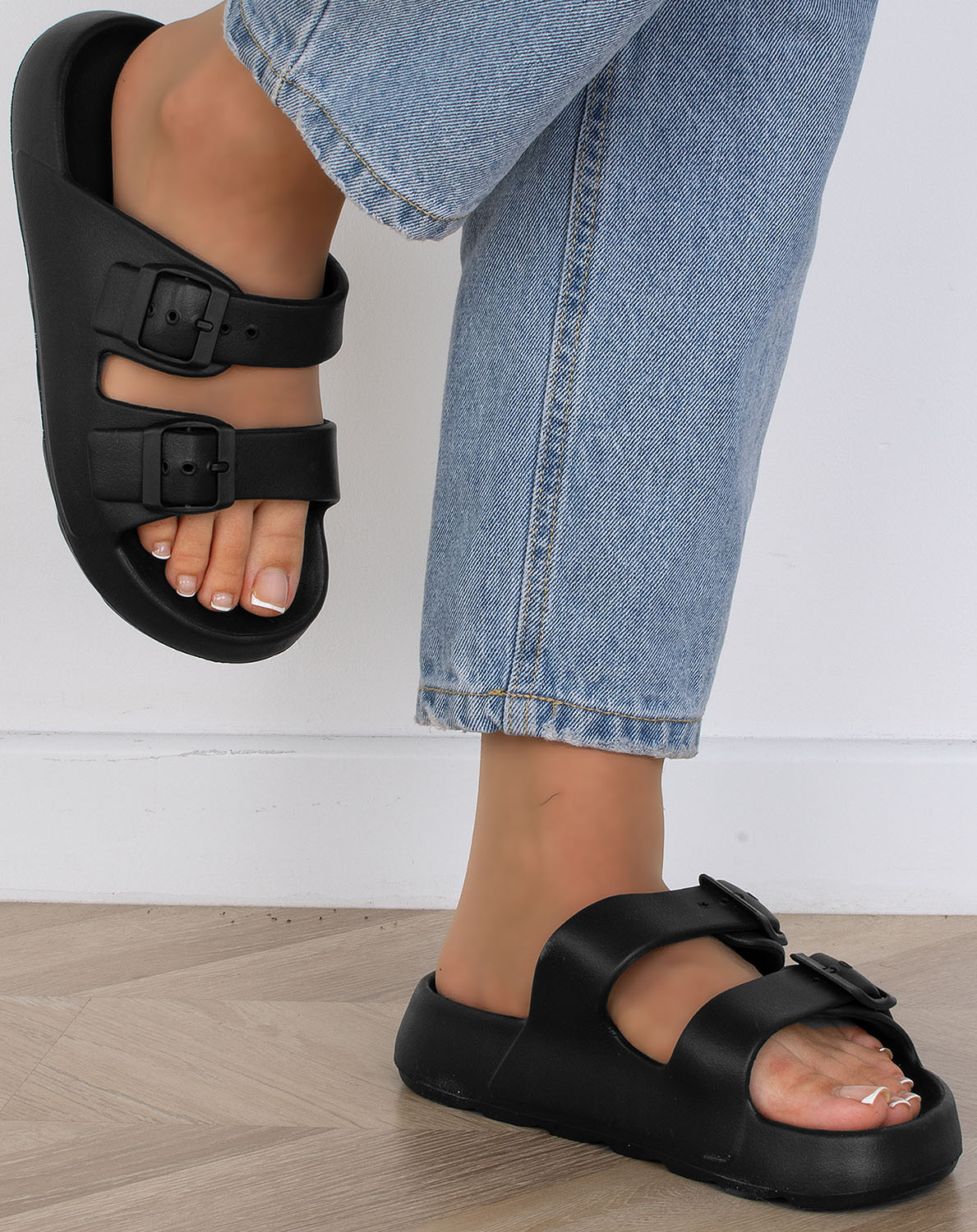 • Czarne klapki na platformie to oryginalne obuwie, które łączy w sobie wygodę i styl. Ich kolorystyka nadaje im świeży i nowoczesny wygląd, który doskonale komponuje się z letnimi stylizacjami.