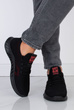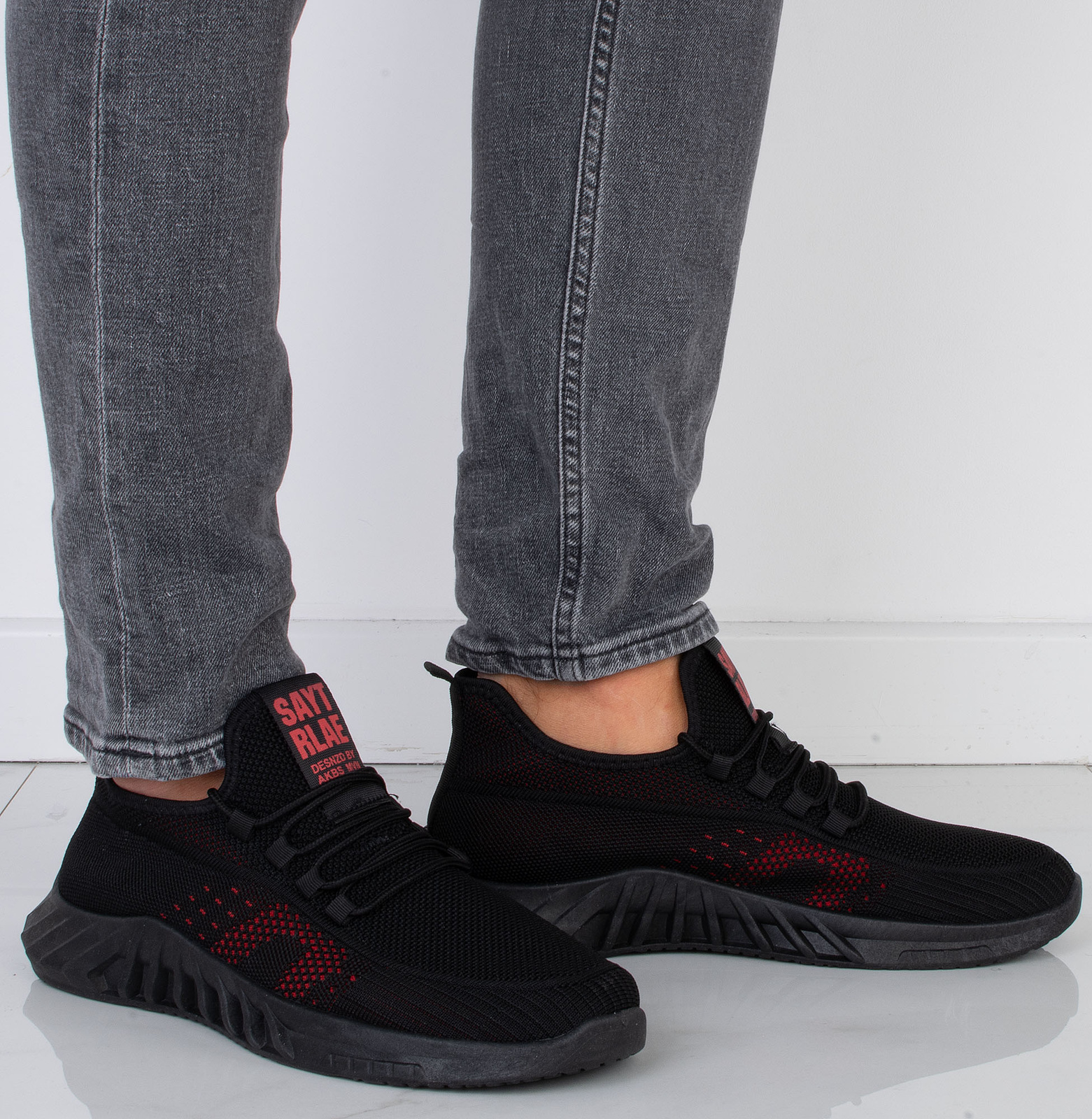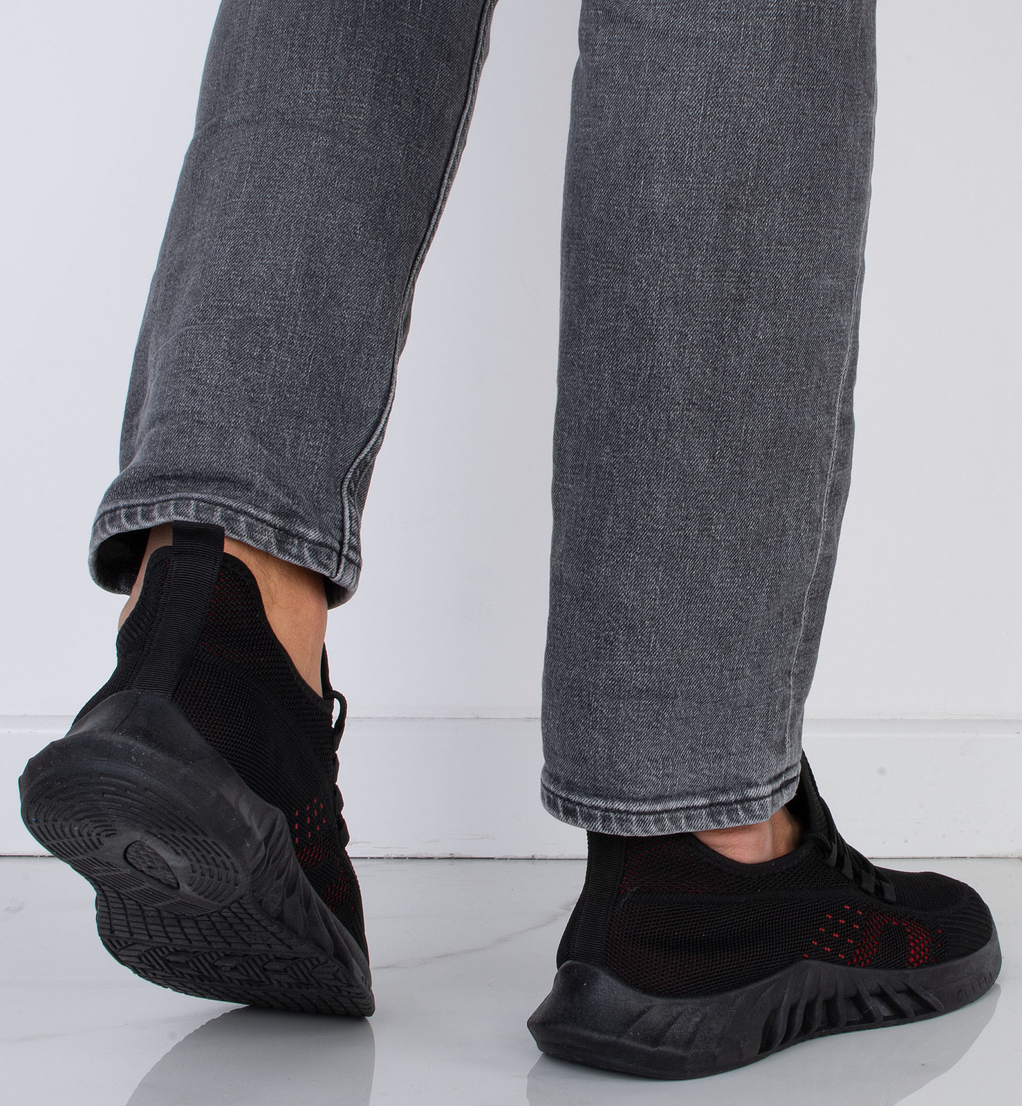 • Męskie buty sportowe wykonane z materiału tkaninowego w kolorze czarnym z czerwonymi wstawkami. Obuwie sznurowane, lekka sportowa podeszwa, idealne na wiosnę.