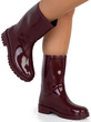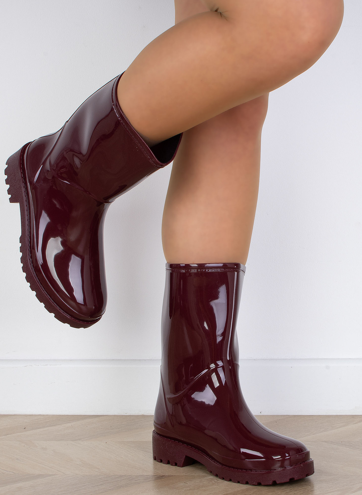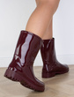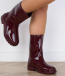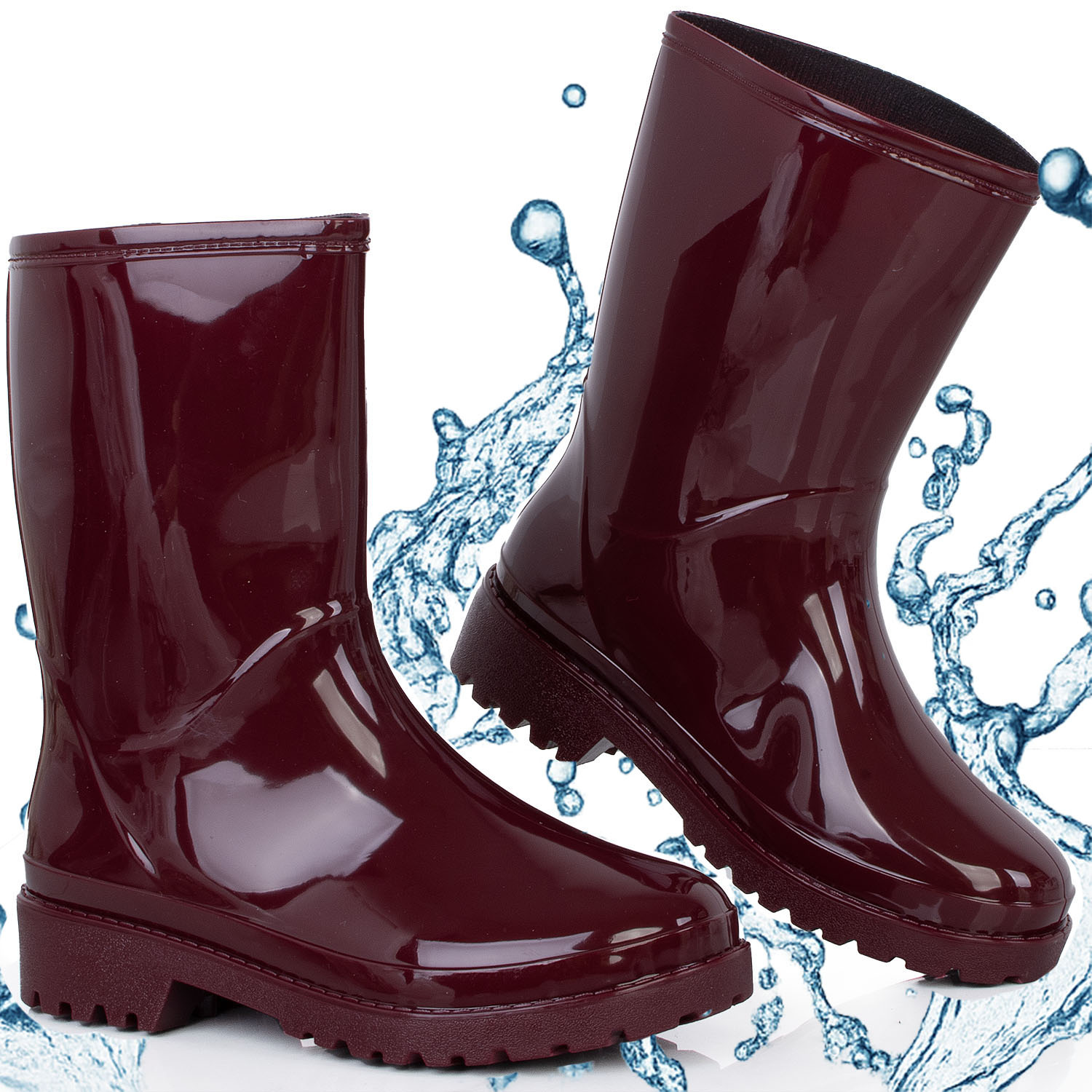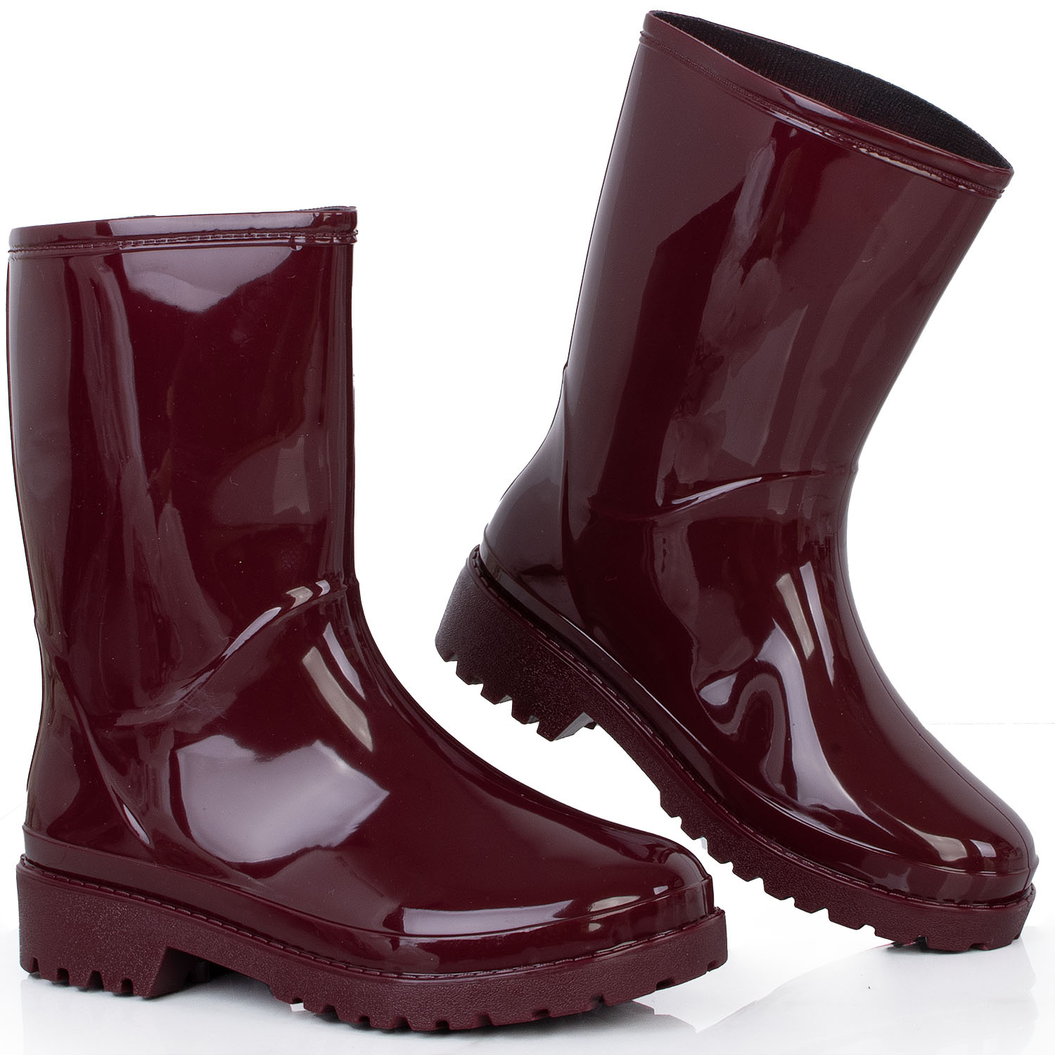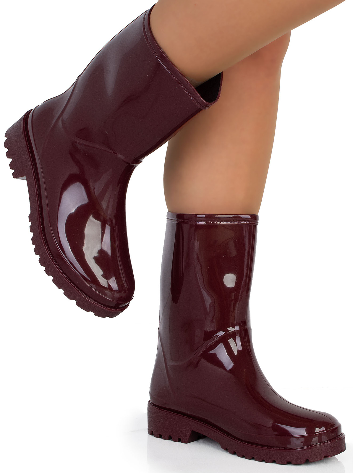• Bordowe błyszczące kalosze damskie wykonane z tworzywa gumowego. Model który dopasowuje się do szerokości nogi. Idealne na jesienne, deszczowe dni!