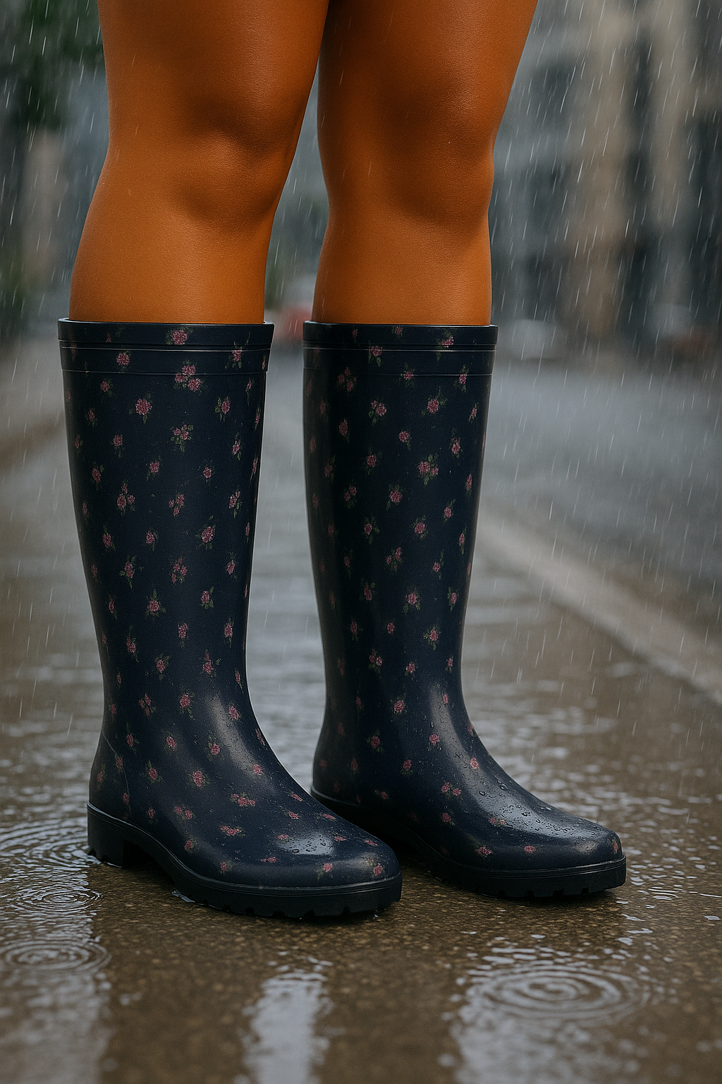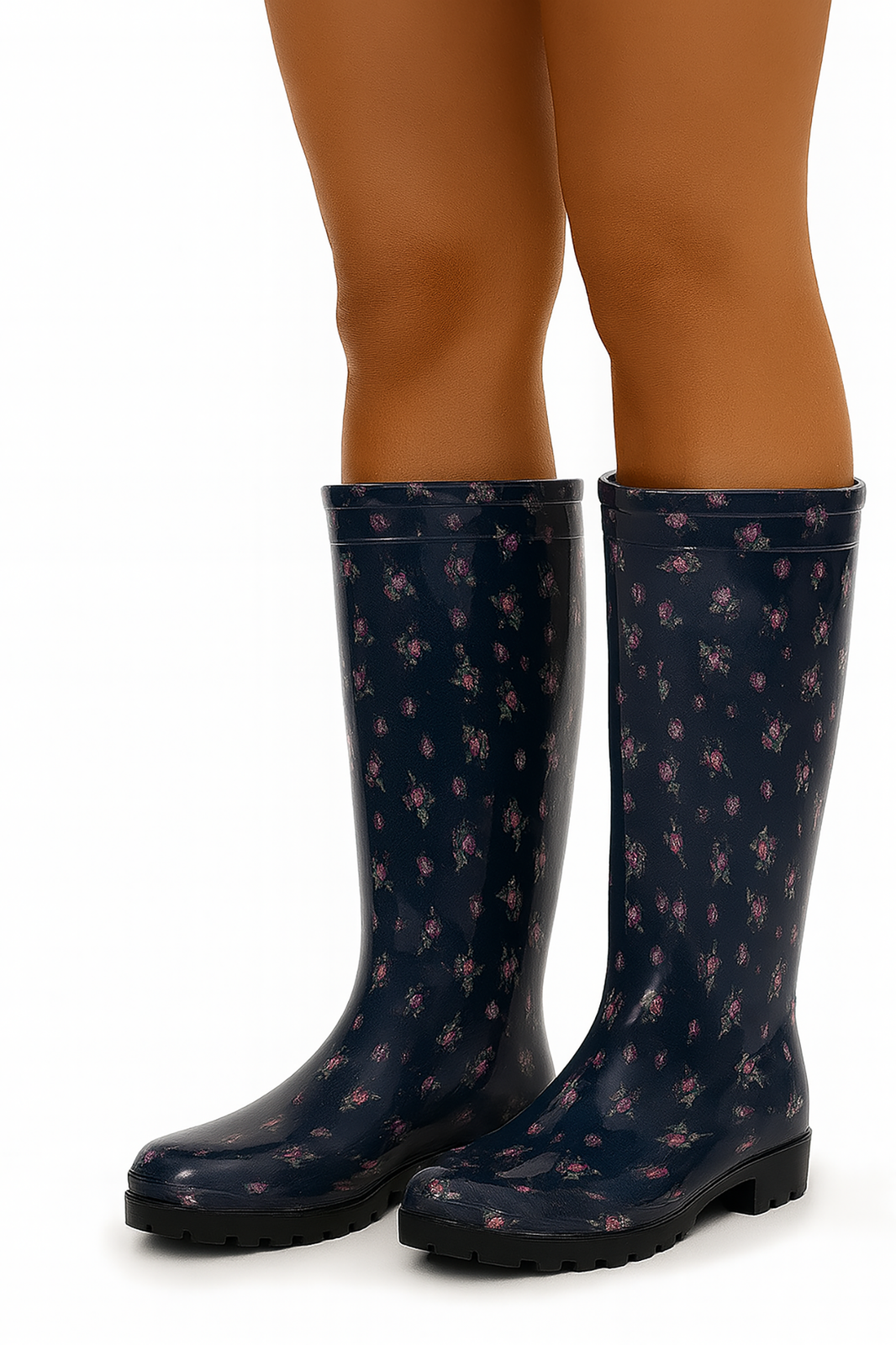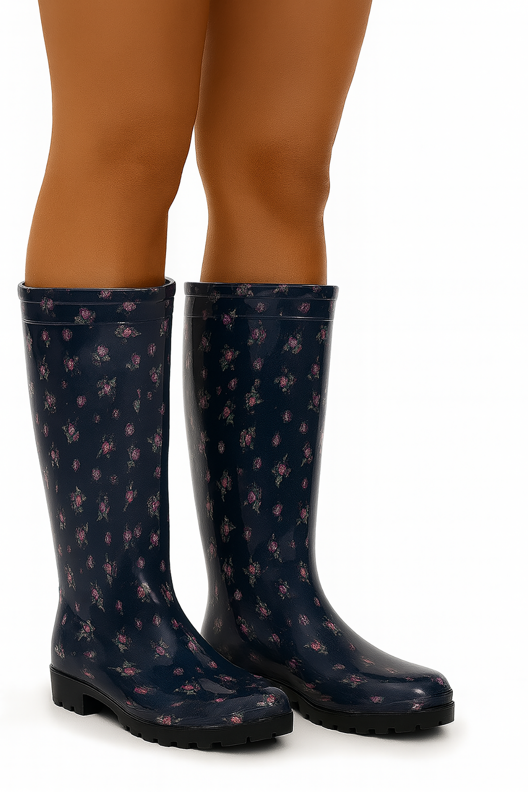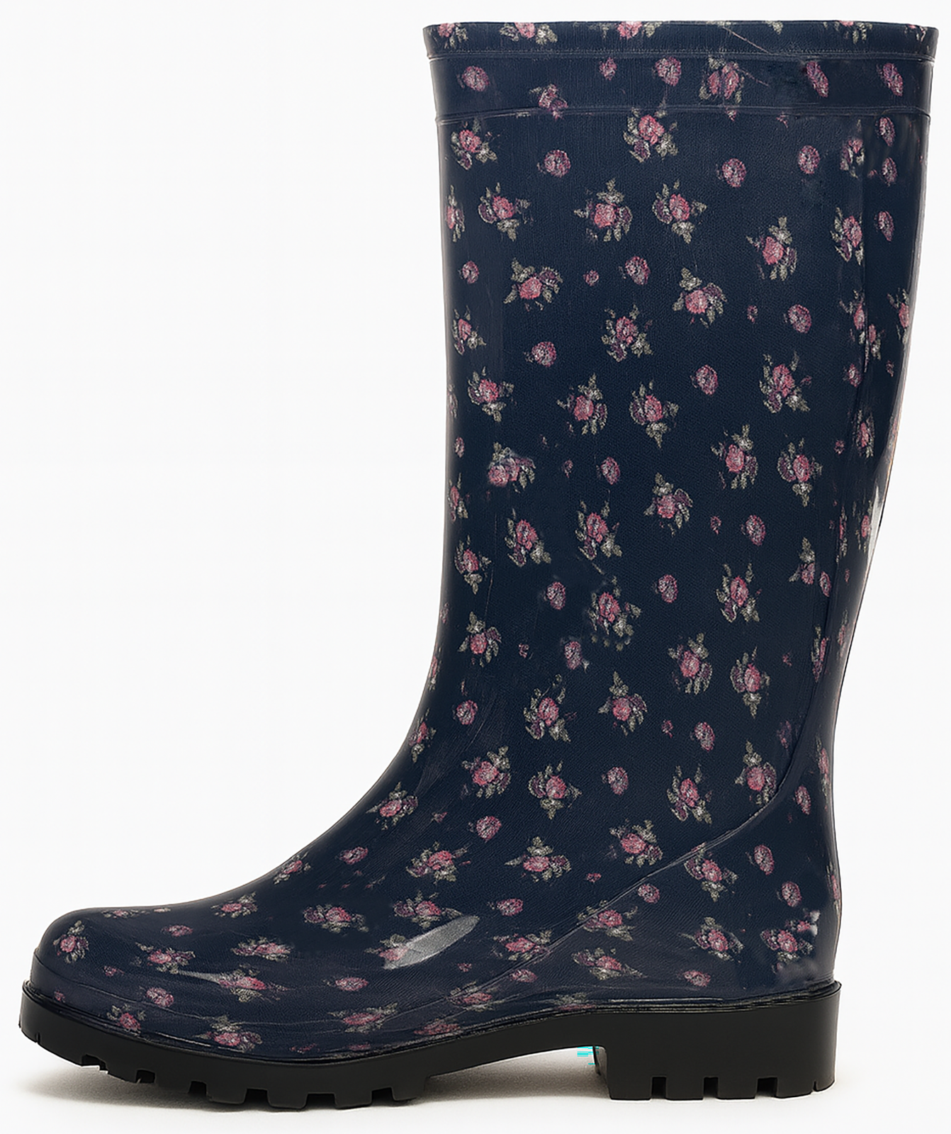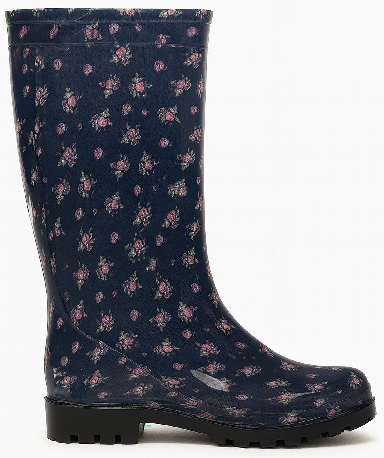 Granatowe kalosze z motywem kwiatów, błyszczące kalosze damskie wykonane z tworzywa gumowego. Lakierowane kalosze to idealne rozwiązanie dla kobiet, które cenią sobie modny wygląd nawet w deszczowe dni. Ich połyskujące wykończenie oraz cholewka sprawiają, że są nie tylko praktyczne, ale również stylowe i uniwersalne, idealne na jesienno-wiosenną pogodę. Wykonane z wytrzymałego i wodoodpornego materiału syntetycznego o lakierowanym wykończeniu, które nadaje butom elegancki połysk i nowoczesny wygląd. Te stylowe kalosze łączą w sobie modę i wygodę, sprawiając, że deszczowe dni stają się o wiele przyjemniejsze!