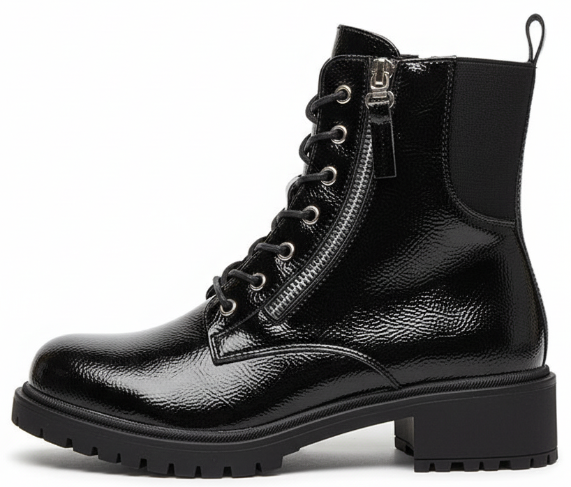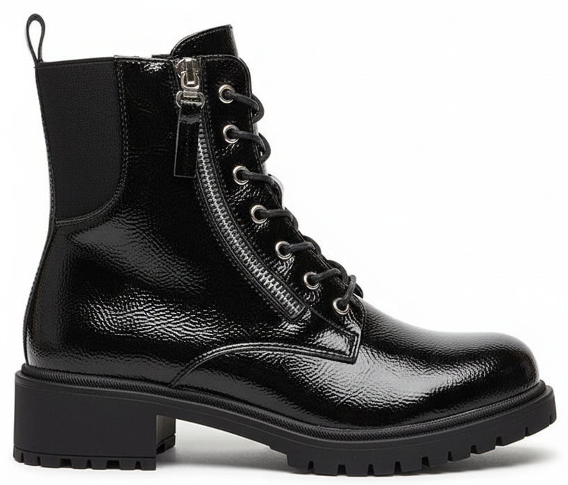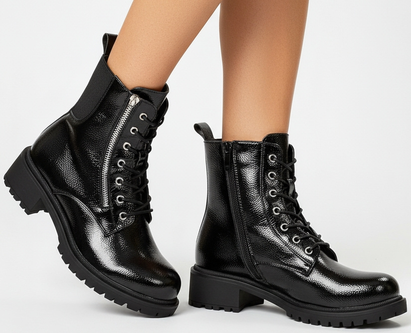 Czarne damskie ocieplane botki typu glany, zwane również workerami, to propozycja dla kobiet ceniących połączenie stylu, wygody i funkcjonalności. Wykonane z wysokiej jakości lakierowanej skóry ekologicznej prezentują się wyjątkowo efektownie – ich połyskująca powierzchnia dodaje charakteru każdej stylizacji, podkreślając indywidualny styl i pewność siebie. To idealny wybór dla kobiet, które lubią łączyć klasyczną czerń z nowoczesnym, miejskim designem.