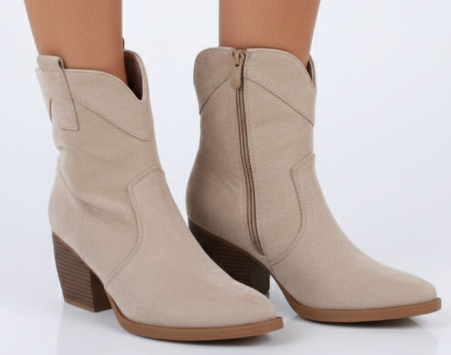 Beżowe zamszowe wysokie kowbojki to połączenie klasycznego, westernowego stylu z kobiecą elegancją i modowym wyczuciem. Wykonane z miękkiego, przyjemnego w dotyku zamszu, prezentują się niezwykle efektownie i stylowo, podkreślając nogi oraz dodając sylwetce lekkości. Ich delikatny beżowy kolor wprowadza subtelność i naturalny charakter, który doskonale komponuje się zarówno z jasnymi, jak i ciemniejszymi elementami garderoby. To model, który idealnie wpisuje się w najnowsze trendy, jednocześnie pozostając ponadczasowy. Doskonale sprawdzą się w sezonie jesienno-zimowym oraz wczesną wiosną, stanowiąc eleganckie uzupełnienie każdej stylizacji. To buty, które przyciągają uwagę, dodają charakteru i podkreślają indywidualny styl – idealne dla kobiet, które lubią wyglądać modnie i z klasą.