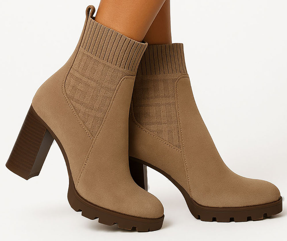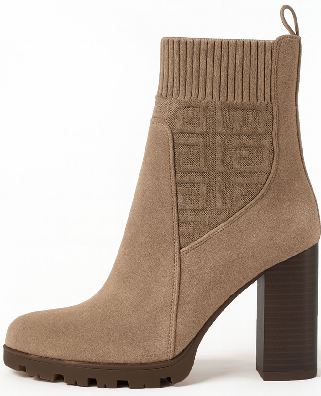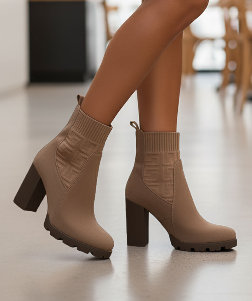 Ten model to harmonijne zestawienie faktur: dolna część cholewki została wykonana z gładkiego, luksusowo wyglądającego materiału imitującego zamsz, który otula stopę. Najbardziej charakterystycznym elementem jest jednak górna, elastyczna wstawka w stylu 'sock boot', przypominająca grubą, prążkowaną dzianinę. W centrum uwagi znajduje się ten dzianinowy panel, ozdobiony subtelnym, geometrycznym monogramem lub tłoczonym wzorem, który dodaje butom wysokiej klasy, dyskretnego detalu.