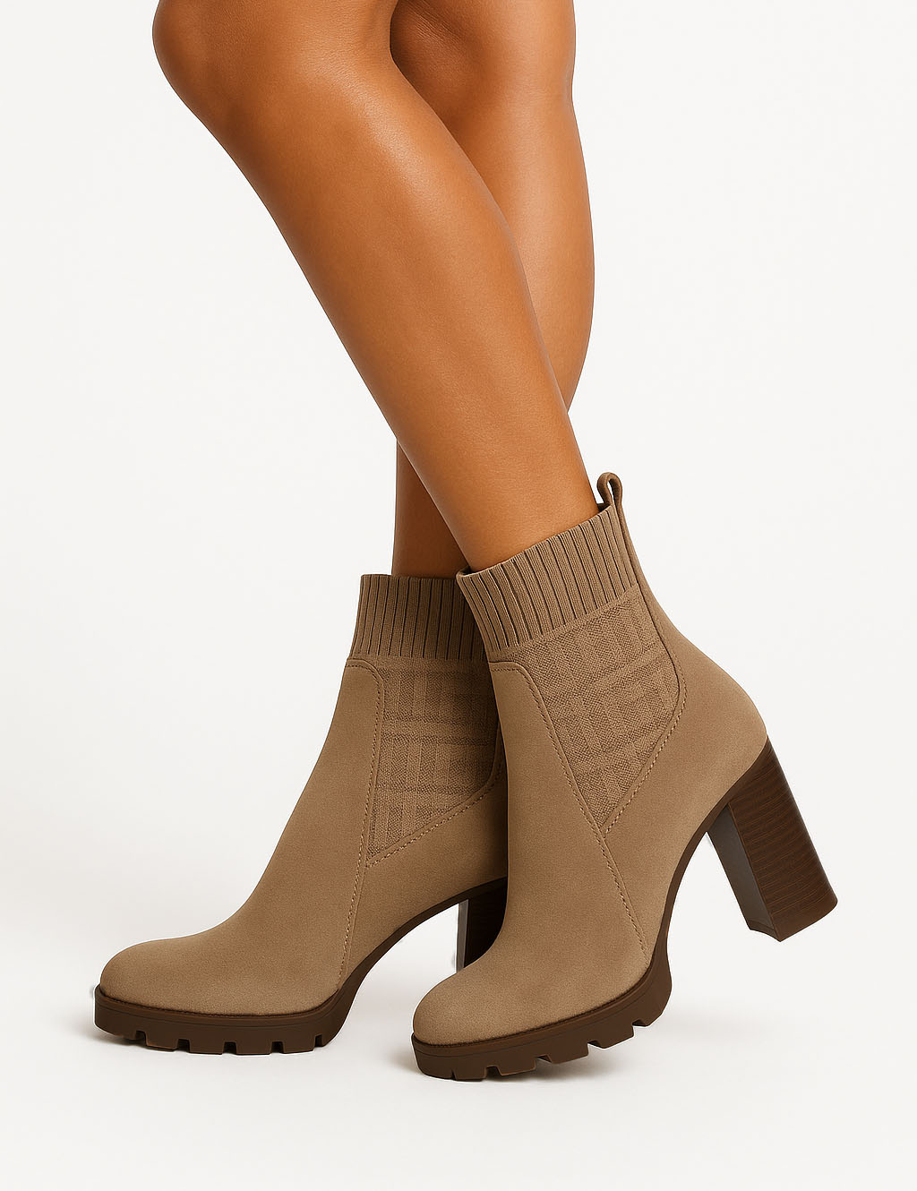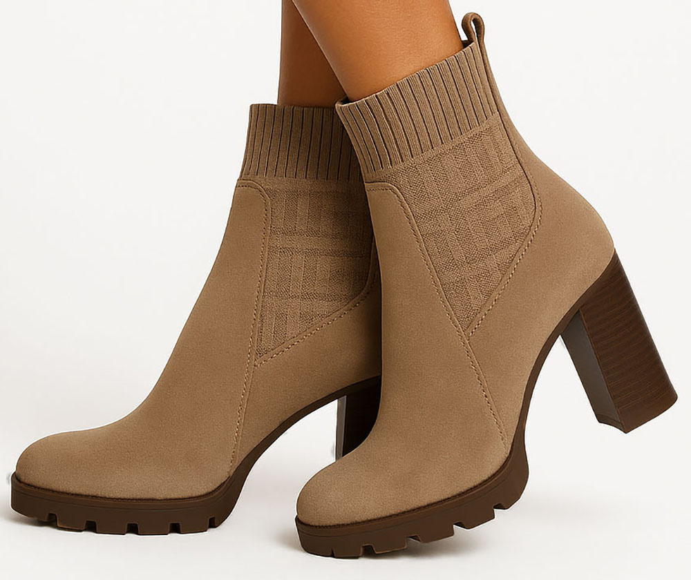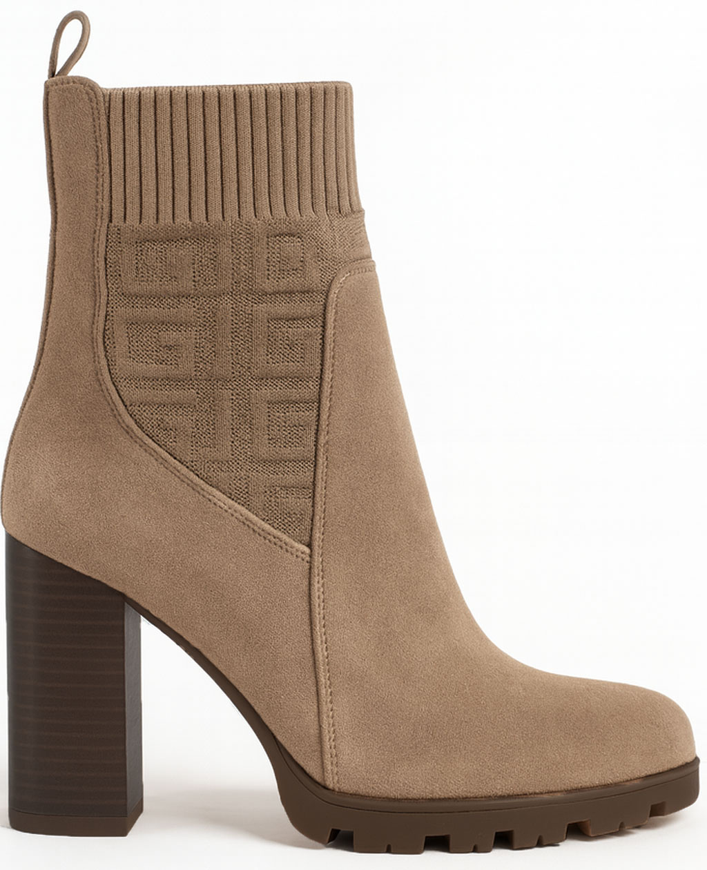 Ten model to harmonijne zestawienie faktur: dolna część cholewki została wykonana z gładkiego, luksusowo wyglądającego materiału imitującego zamsz, który otula stopę. Najbardziej charakterystycznym elementem jest jednak górna, elastyczna wstawka w stylu 'sock boot', przypominająca grubą, prążkowaną dzianinę. W centrum uwagi znajduje się ten dzianinowy panel, ozdobiony subtelnym, geometrycznym monogramem lub tłoczonym wzorem, który dodaje butom wysokiej klasy, dyskretnego detalu.