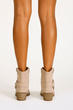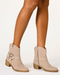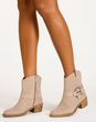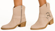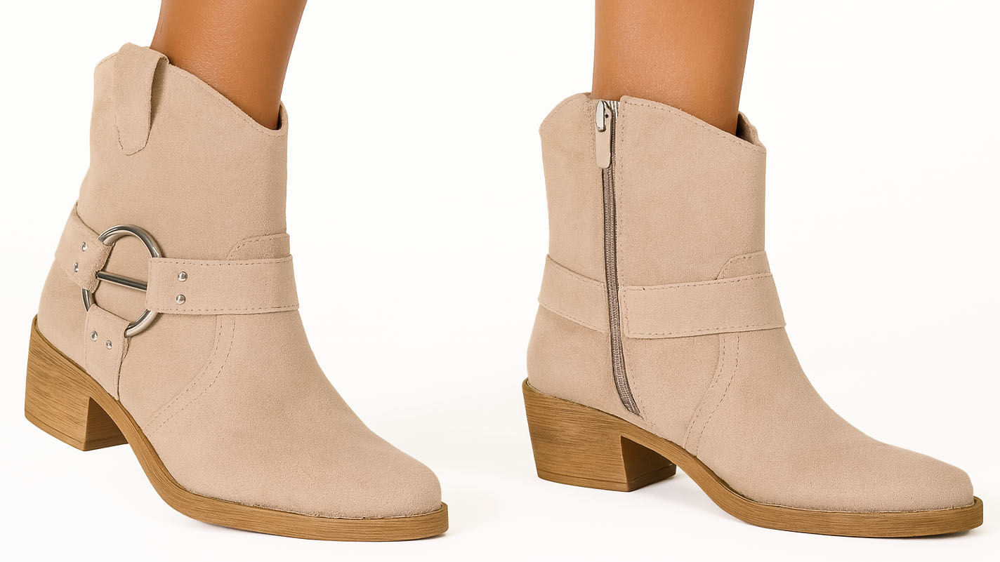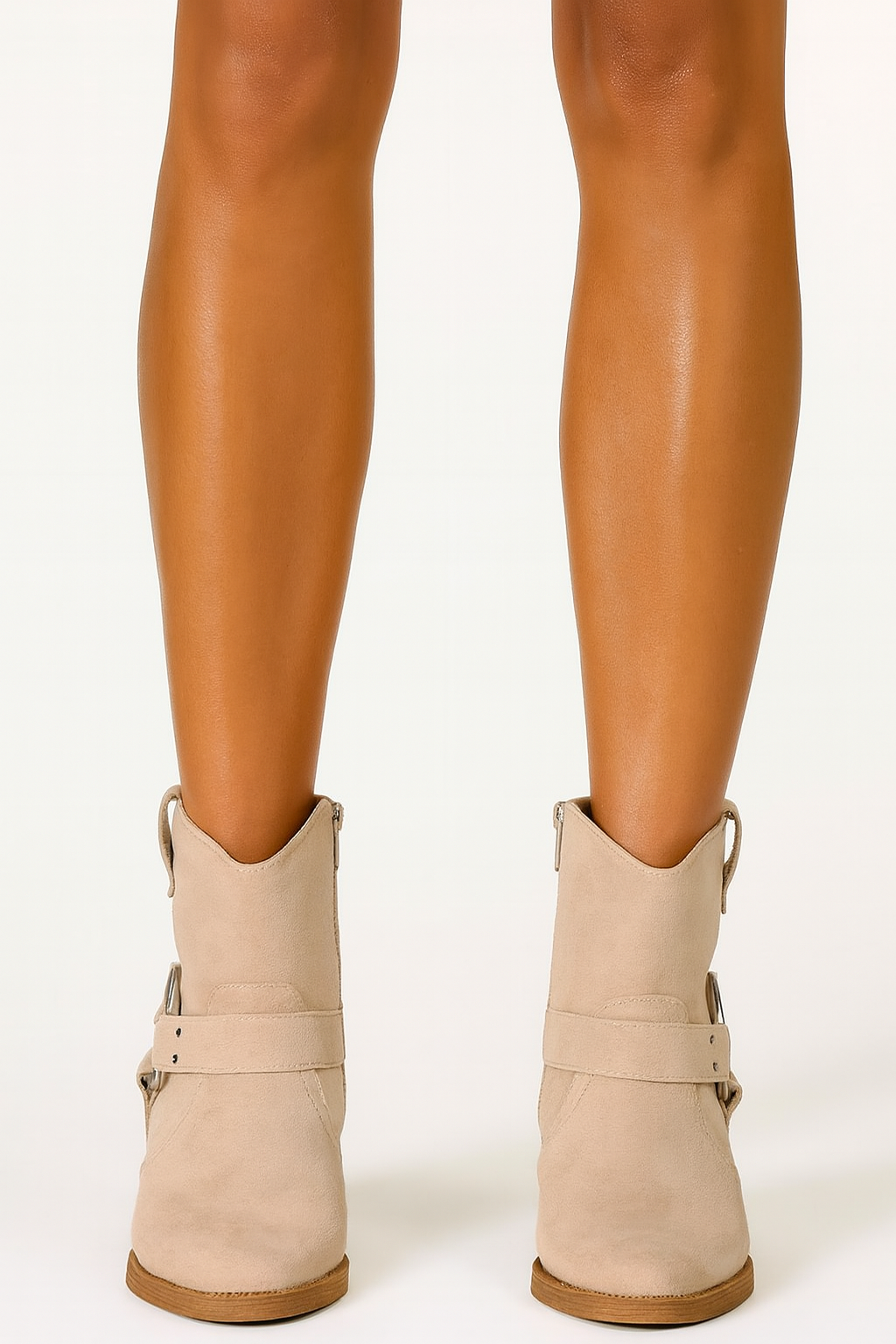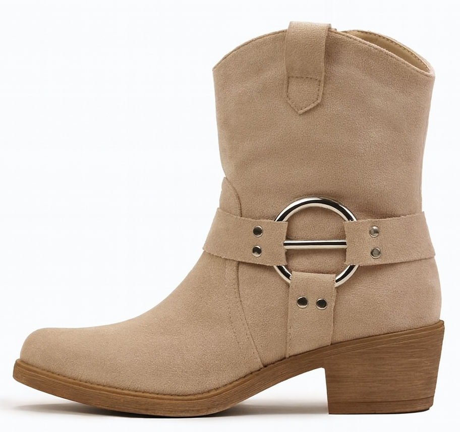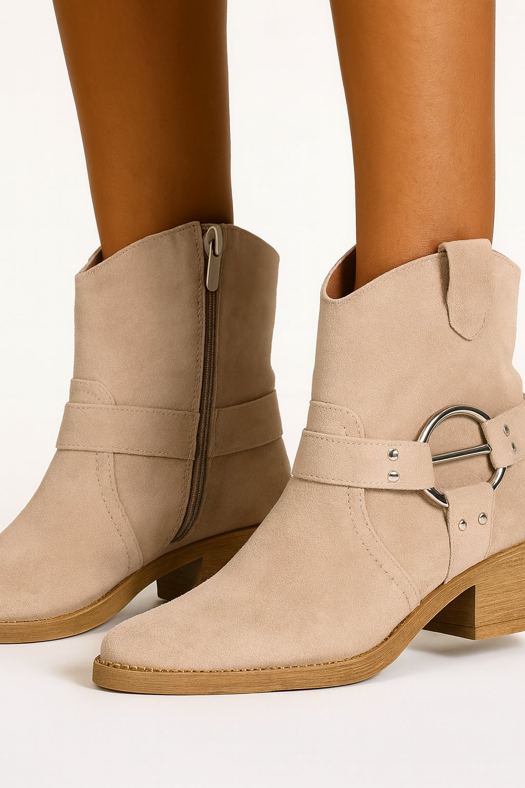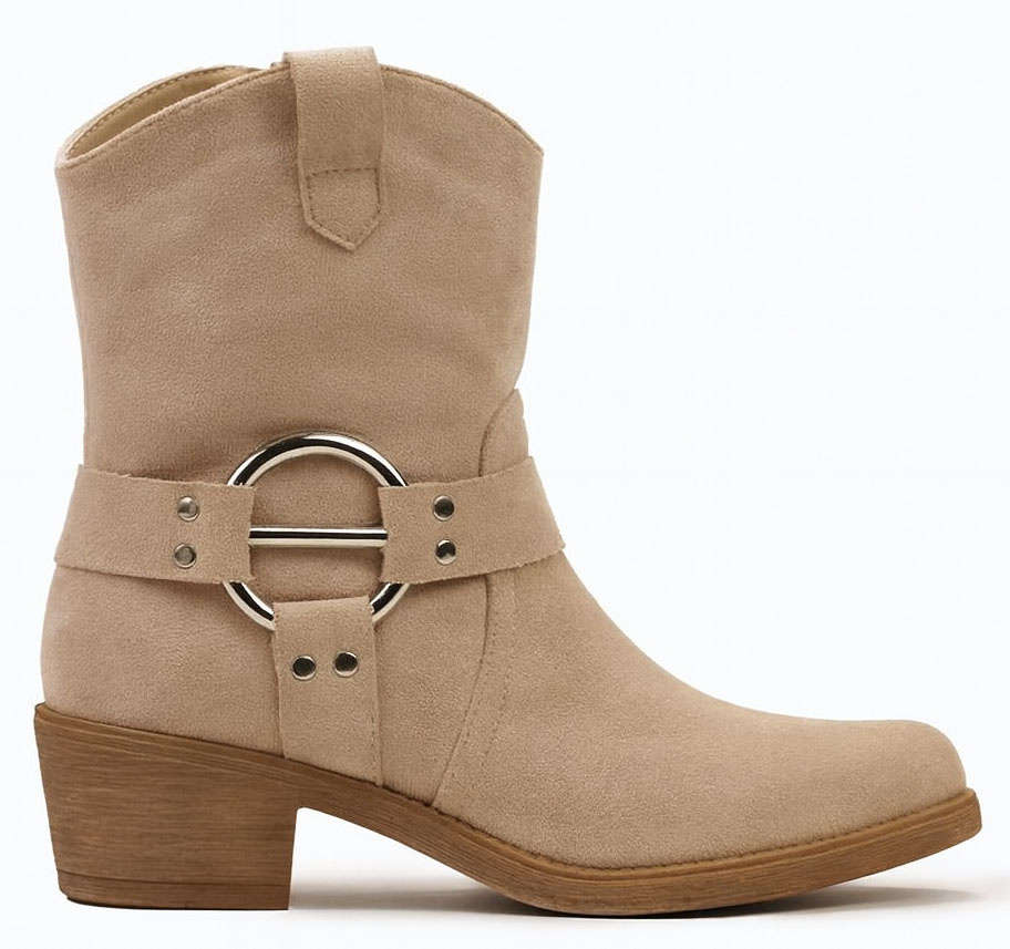 Te stylowe, krótkie botki w kolorze klasycznego beżu to idealne połączenie miejskiego szyku i westernowego akcentu, stanowiące must-have w każdej garderobie. Wykonane z eleganckiego, matowego materiału o zamszowej fakturze, sięgają nieco ponad kostkę i osadzone są na stabilnym, niewysokim, klockowym obcasie, który zapewnia komfort noszenia przez cały dzień. Ich design wzbogaca ozdobny pasek oplatający cholewkę, który z boku akcentuje duża, srebrna, metalowa sprzączka w kształcie okręgu z charakterystycznym wycięciem w środku, nadając całości rockowy, a jednocześnie nowoczesny charakter. Funkcjonalność zapewnia boczny zamek błyskawiczny, umożliwiający łatwe zakładanie i zdejmowanie butów, podczas gdy subtelne przeszycia w kowbojskim stylu, widoczne w górnej części cholewki, dodają im lekko awangardowego sznytu. Idealne do noszenia z jeansami, sukienkami czy spódnicami, te botki z pewnością przyciągną wzrok i dopełnią każdą jesienno-zimową stylizację.