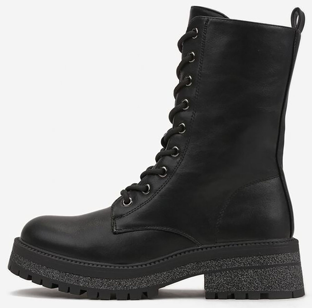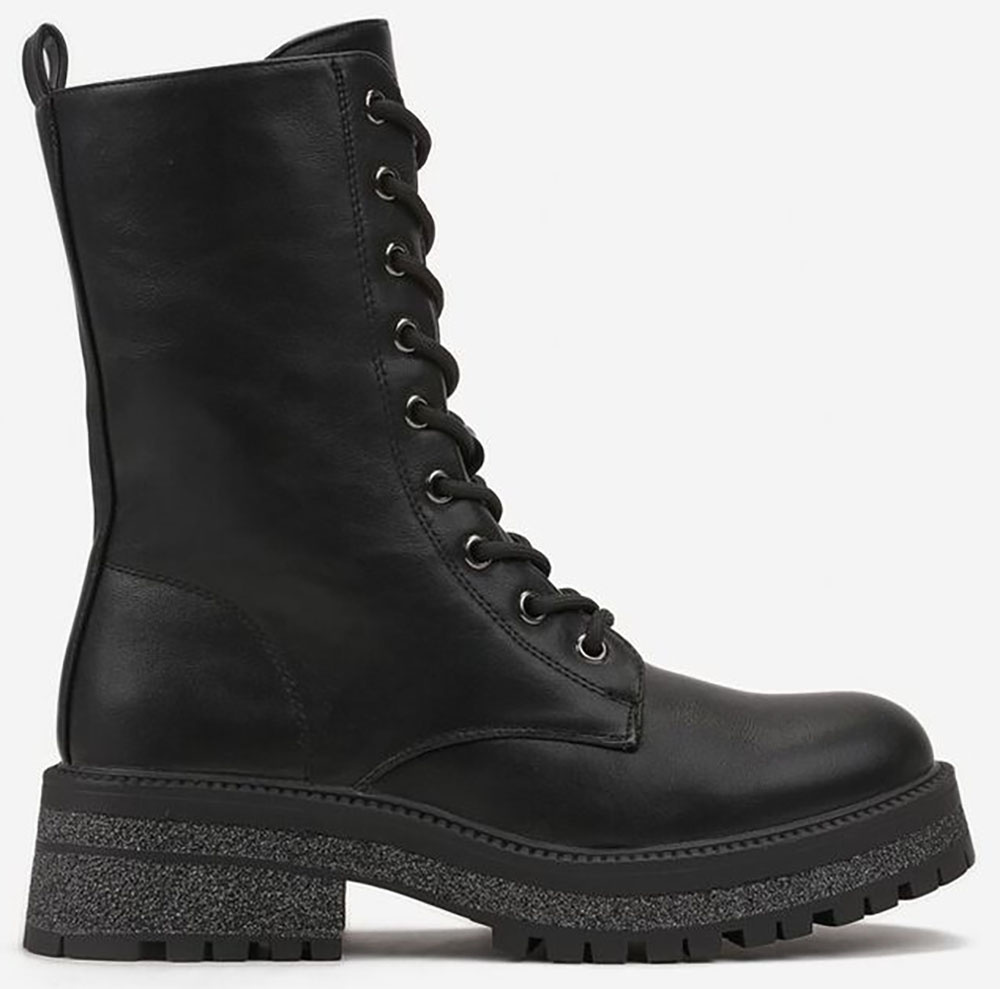 Te zjawiskowe, czarne botki to idealne połączenie klasycznego, militarnego stylu z odważnym, nowoczesnym akcentem glamour, stworzone dla kobiet, które nie boją się wyróżniać. Cholewka o średniej wysokości, wykonana z wysokiej jakości, gładkiej imitacji skóry w głębokim, matowym odcieniu czerni, zapewnia elegancki wygląd i łatwość w pielęgnacji. Charakterystyczny dla bojówek fason zyskuje na funkcjonalności dzięki klasycznemu sznurowaniu na metalowe, solidne oczka, które pozwala na idealne dopasowanie do łydki. Dodatkowo, dla maksymalnej wygody zakładania i zdejmowania, botki wyposażono w boczny zamek błyskawiczny. Kluczowym elementem, który natychmiast przyciąga wzrok i nadaje obuwiu niepowtarzalny charakter, jest gruba, traperowa podeszwa na platformie z masywnym, ale stabilnym obcasem, której krawędź została wykończona błyszczącym, brokatowym obsypaniem w odcieniach szarości i srebra. Ten błyszczący detal kontrastuje z surową czernią cholewki, przekształcając klasyczną "glanę" w modny, wieczorowy dodatek. Platforma nie tylko dodaje wysokości, ale także zapewnia komfort i izolację od podłoża, czyniąc te botki idealnym wyborem na chłodniejsze dni i do noszenia przez wiele godzin. Są one doskonałe zarówno do rockowych i grunge'owych stylizacji z podartymi jeansami i skórzaną kurtką, jak i do przełamywania romantycznych sukienek, dodając strojowi pazura i wyrazistości. To obuwie dla pewnej siebie kobiety, która ceni sobie modny design, trwałość i odrobinę błysku w codziennym życiu.