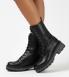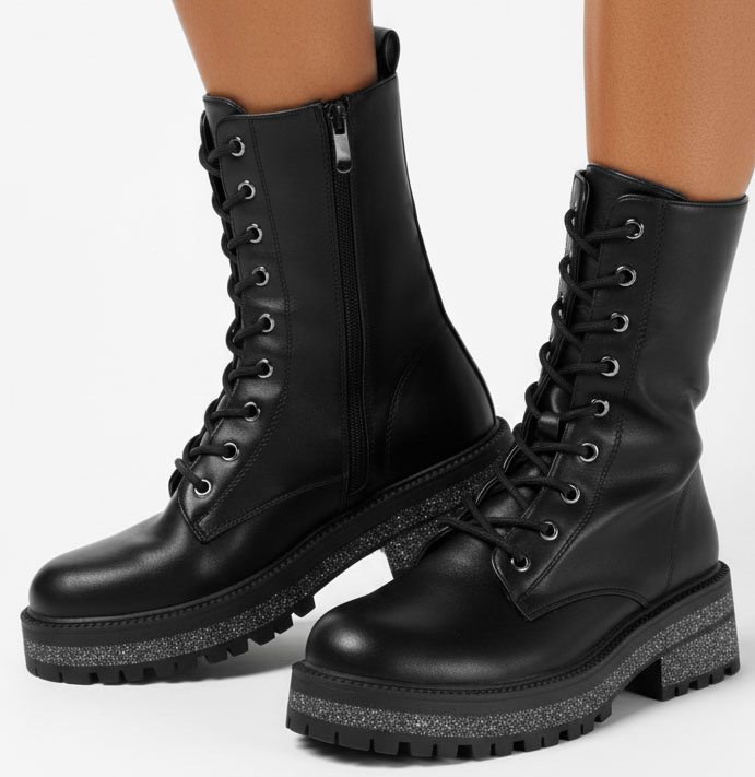 • Te zjawiskowe, czarne botki to idealne połączenie klasycznego, militarnego stylu z odważnym, nowoczesnym akcentem glamour, stworzone dla kobiet, które nie boją się wyróżniać.