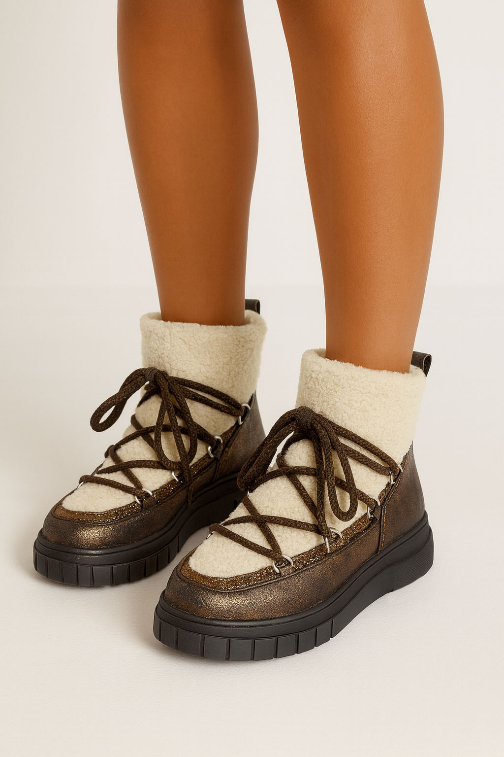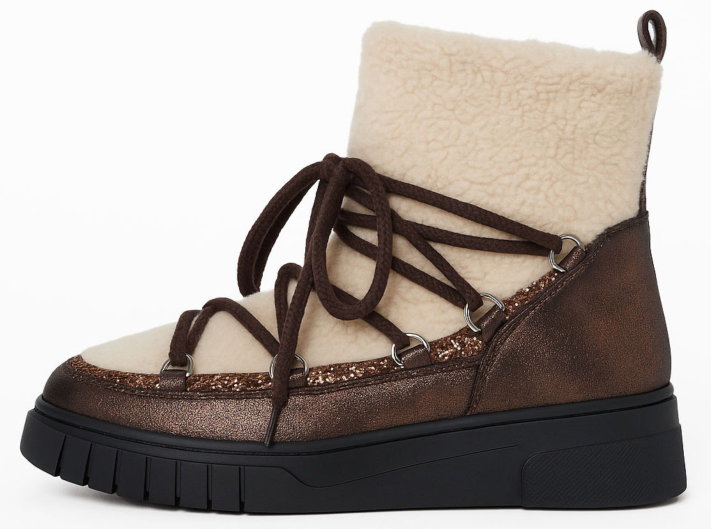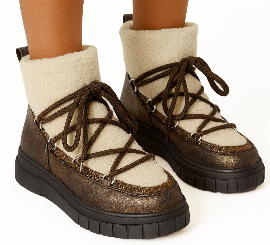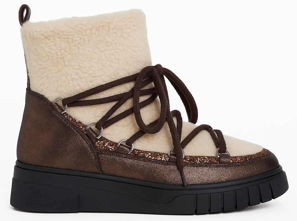 Wykonane z wysokiej jakości materiałów, wyróżniają się efektownym połączeniem brązowej, lekko połyskującej eko skóry z miękkim, kremowym kożuchem, który zapewnia nie tylko wyjątkowy komfort, ale też ciepło nawet w najzimniejsze dni.