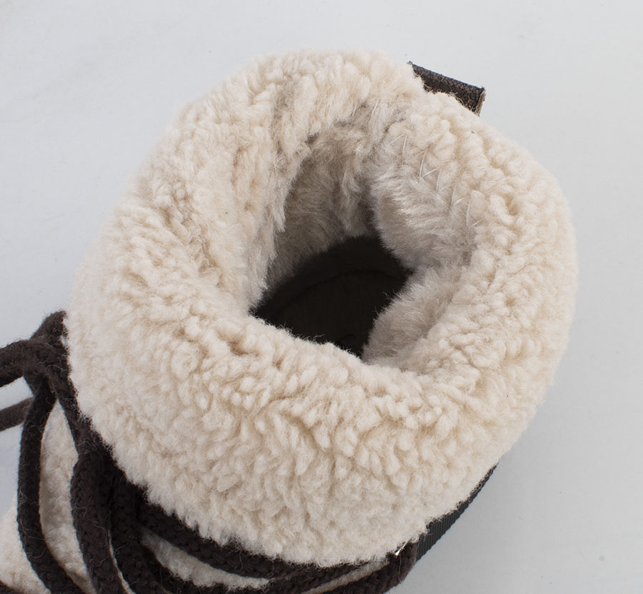 • Wykonane z wysokiej jakości materiałów, wyróżniają się efektownym połączeniem brązowej, lekko połyskującej skóry z miękkim, kremowym kożuchem, który zapewnia nie tylko wyjątkowy komfort, ale też ciepło nawet w najzimniejsze dni.