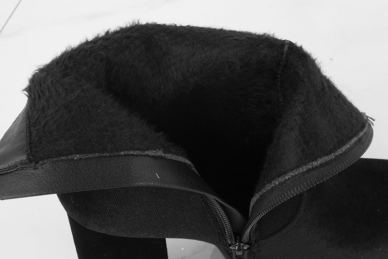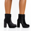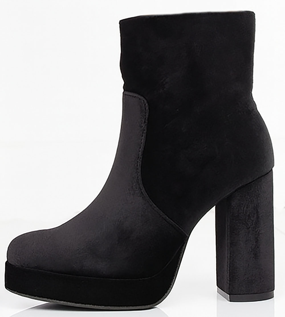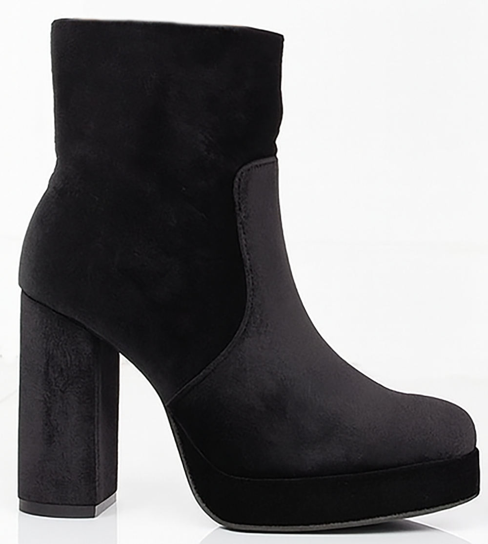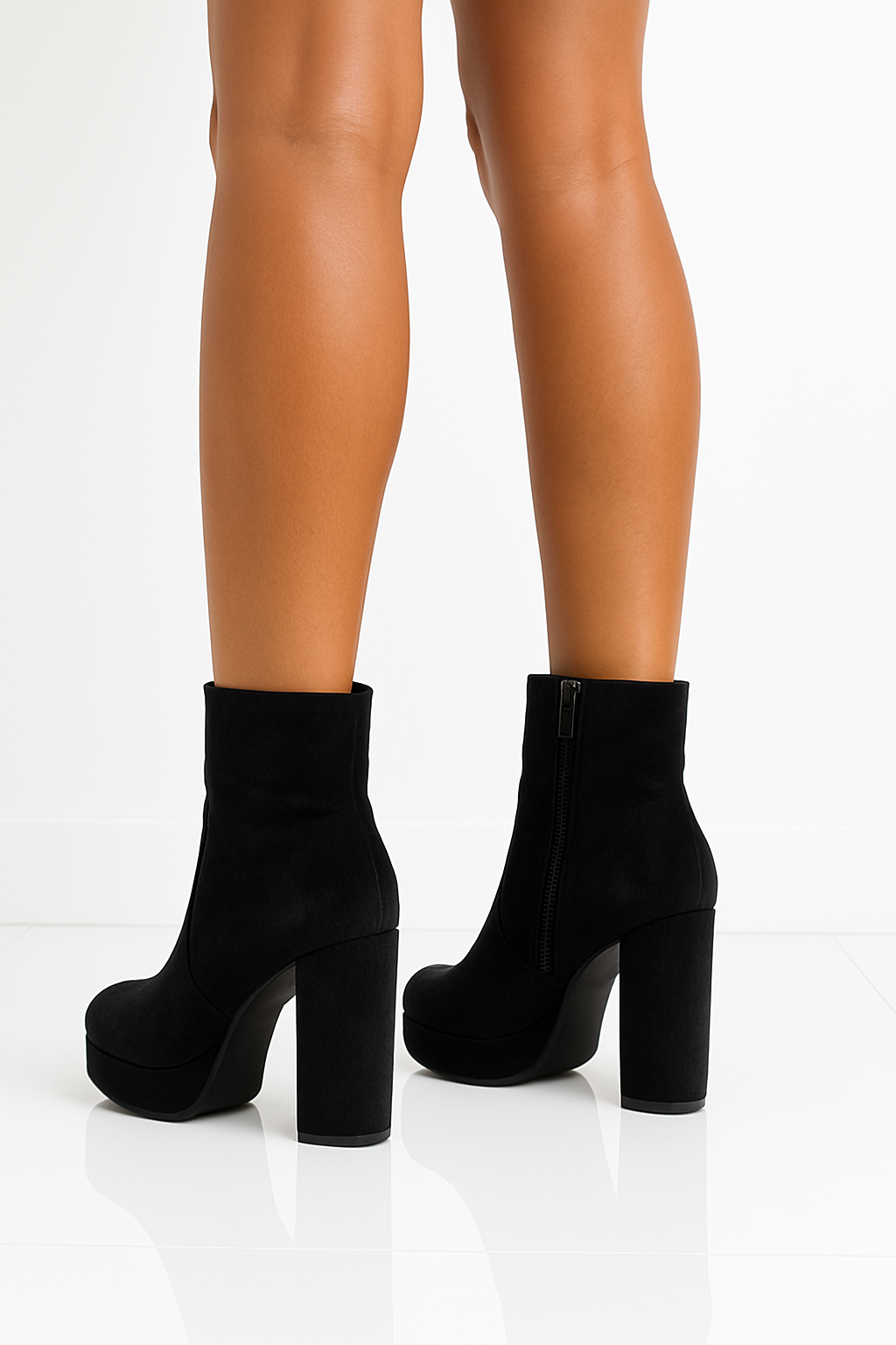 Ten wyjątkowy model botków to połączenie zmysłowej elegancji z nowoczesną, miejską wygodą, idealnie wpisujące się w trendy sezonu: botki wykonane z głębokiego, intensywnie czarnego materiału, który, w zależności od światła, może sugerować luksusowy, miękki aksamit lub szlachetny zamsz, nadający im wyrafinowanego charakteru i niezwykłej głębi.