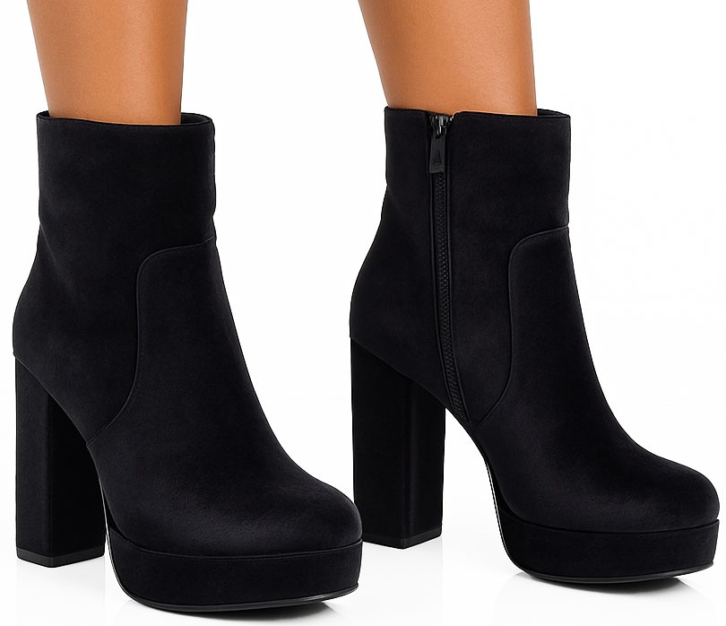 Kluczowym elementem konstrukcyjnym jest masywna, ale proporcjonalna podeszwa: wysoki, stabilny obcas typu słupek, który fantastycznie wydłuża sylwetkę, jest zrównoważony przez grubą platformę z przodu, co minimalizuje faktyczną wysokość podbicia, gwarantując komfort i pewność stąpania przez cały dzień lub noc, bez rezygnacji z imponującej wysokości. Cholewka sięgająca tuż nad kostkę idealnie modeluje nogę, a dopasowany krój subtelnie otula dolną część łydki; dla maksymalnej funkcjonalności, z boku botków umieszczono dyskretny, czarny zamek błyskawiczny, który ułatwia szybkie zakładanie i zdejmowanie, jednocześnie stanowiąc estetyczny, minimalistyczny akcent.