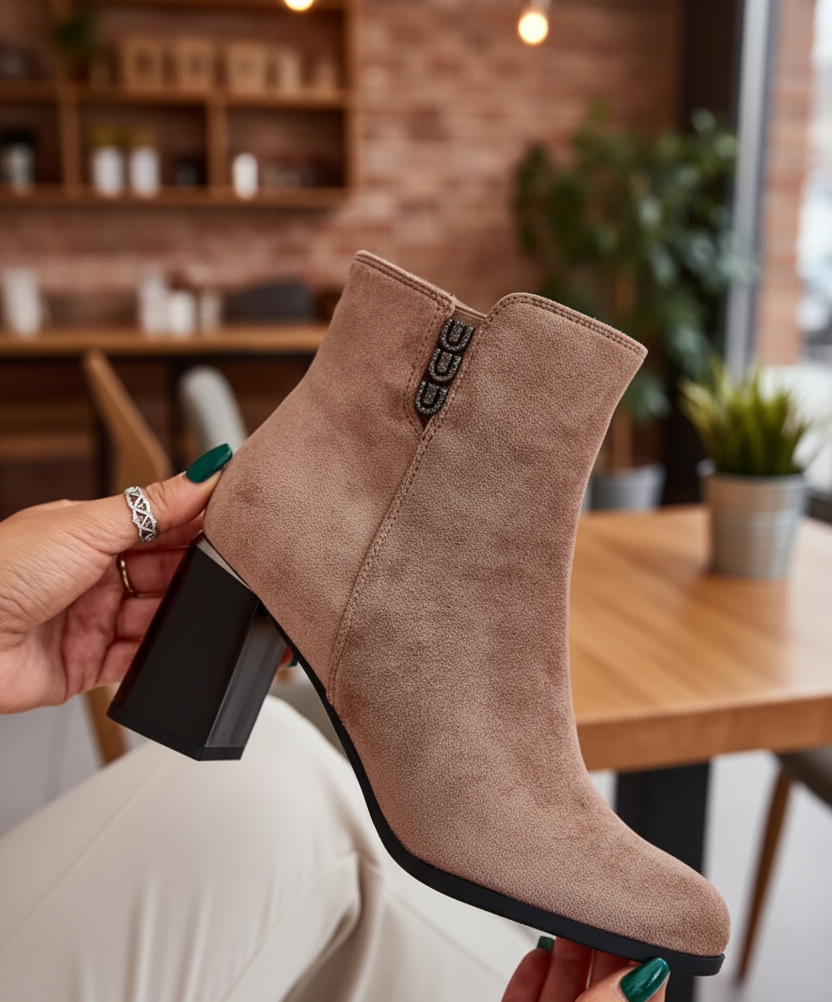 • Zamszowe botki na słupku, które łączą w sobie elegancję, wygodę i ponadczasowy styl. Te botki są idealnym wyborem dla osób, które cenią sobie komfort noszenia i jednocześnie chcą prezentować się modnie.