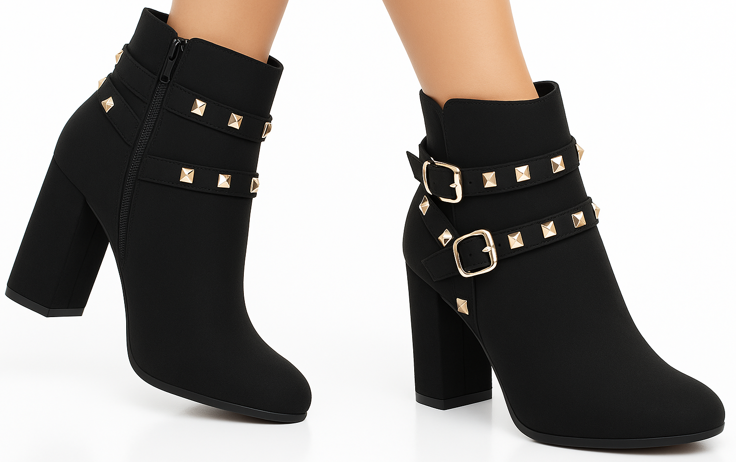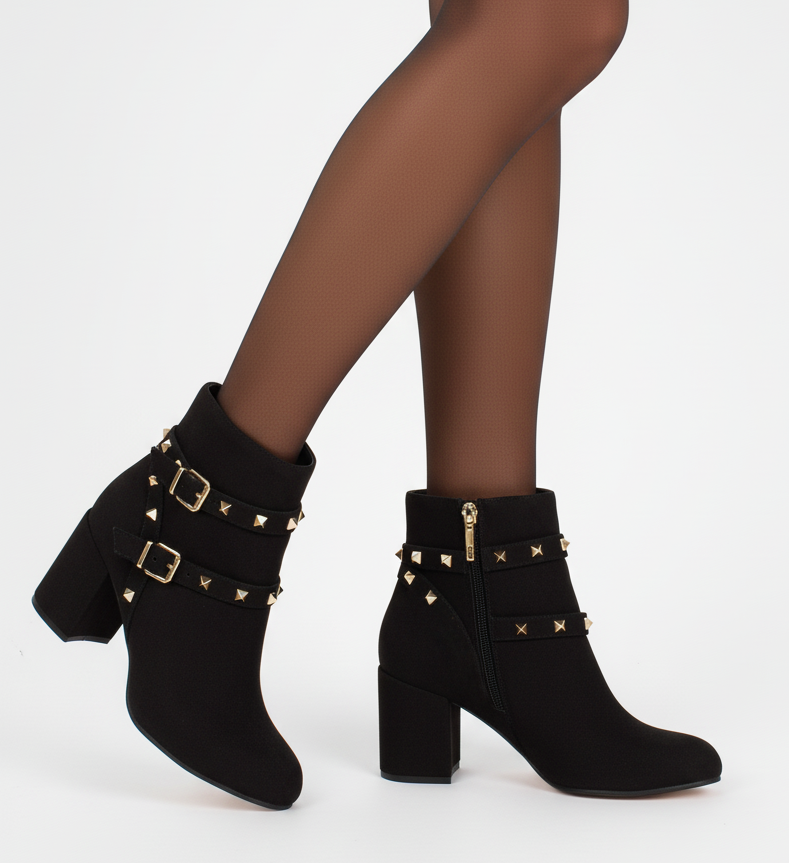 Stylowe czarne botki wykonane z miękkiego, matowego zamszu to ponadczasowy element garderoby, który doskonale uzupełni zarówno codzienne, jak i bardziej eleganckie stylizacje. Klasyczny fason z zaokrąglonym noskiem i stabilnym obcasem typu słupek zapewnia komfort noszenia przez cały dzień.
