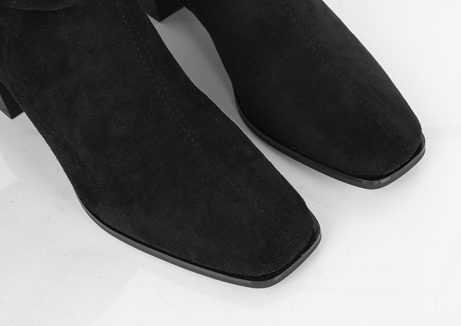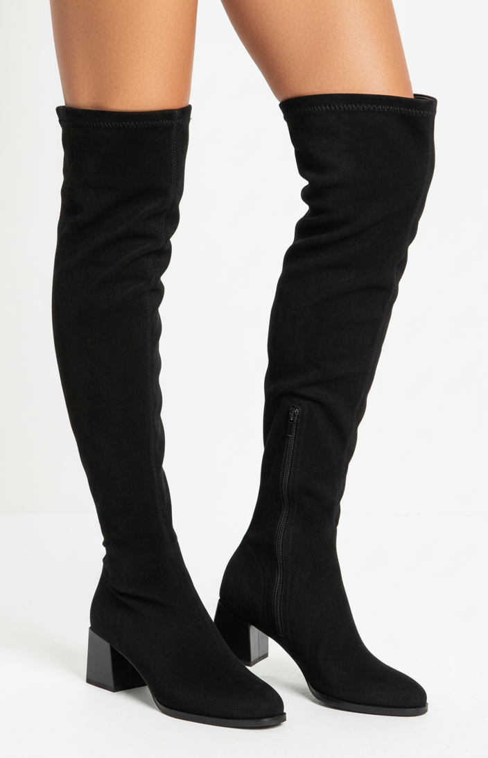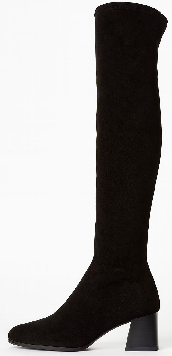 Te zmysłowe, czarne kozaki muszkieterki to kwintesencja jesienno-zimowej elegancji. Wykonane z imitacji zamszu, idealnie dopasowują się do kształtu nogi, podkreślając jej linię. Wygodny, stabilny, gruby obcas zapewnia komfort noszenia przez cały dzień, a migdałowy nosek dodaje klasy. Cholewka buta zapewnia idealne dopasowanie. Zapinane na dyskretny zamek błyskawiczny po wewnętrznej stronie, ułatwiają zakładanie. Idealne do sukienek mini, spódnic i obcisłych spodni!