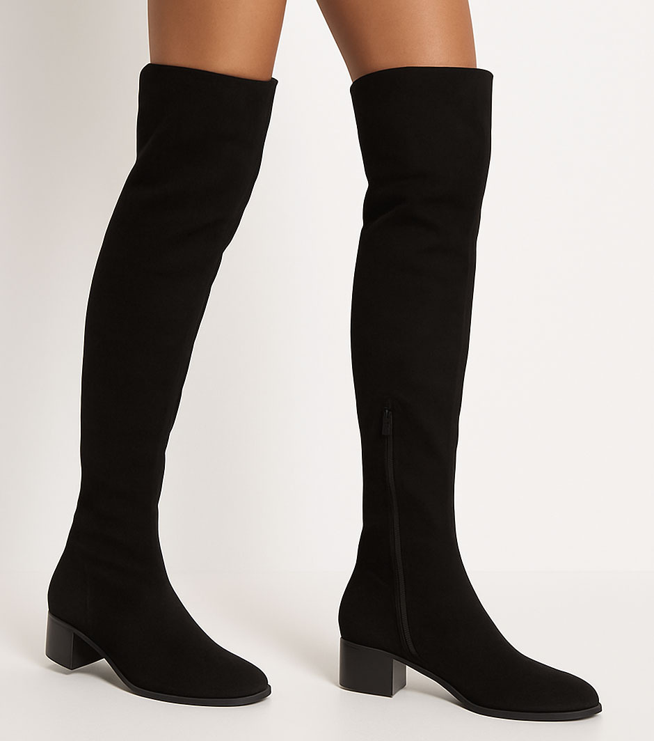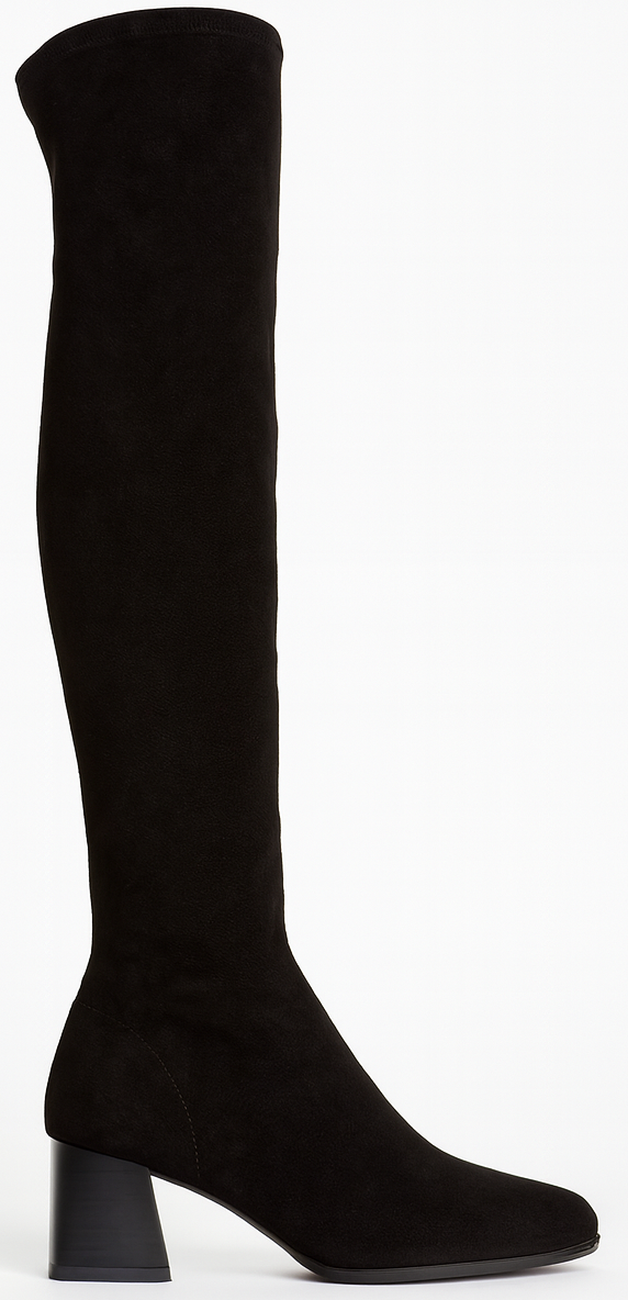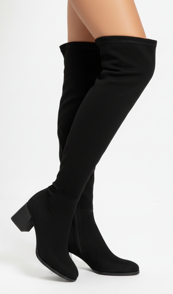 Te zmysłowe, czarne kozaki muszkieterki to kwintesencja jesienno-zimowej elegancji. Wykonane z imitacji zamszu, idealnie dopasowują się do kształtu nogi, podkreślając jej linię. Wygodny, stabilny, gruby obcas zapewnia komfort noszenia przez cały dzień, a migdałowy nosek dodaje klasy. Cholewka buta zapewnia idealne dopasowanie. Zapinane na dyskretny zamek błyskawiczny po wewnętrznej stronie, ułatwiają zakładanie. Idealne do sukienek mini, spódnic i obcisłych spodni!