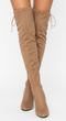 Te zmysłowe beżowe kozaki muszkieterki to kwintesencja jesienno-zimowej elegancji. Wykonane z imitacji zamszu, idealnie dopasowują się do kształtu nogi, podkreślając jej linię. Wygodny, stabilny, gruby obcas zapewnia komfort noszenia przez cały dzień, a szpiczasty nosek dodaje klasy. Ozdobne wiązania z tyłu cholewki nie tylko pięknie wyglądają, ale pozwalają na idealne dopasowanie. Zapinane na dyskretny zamek błyskawiczny po wewnętrznej stronie, ułatwiają zakładanie. Idealne do sukienek mini, spódnic i obcisłych spodni!