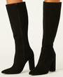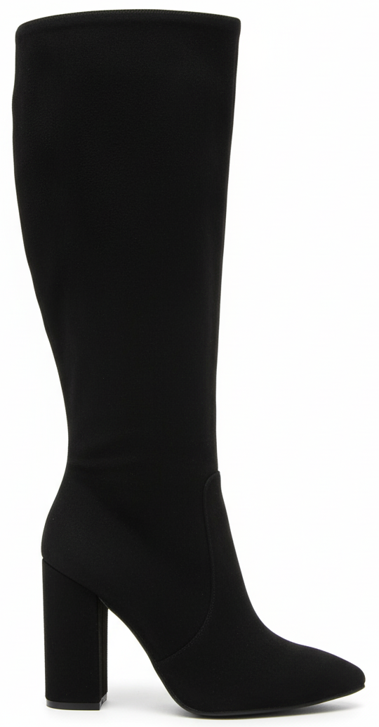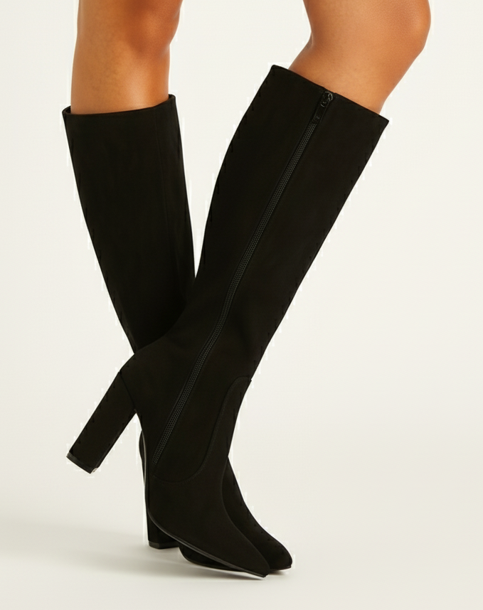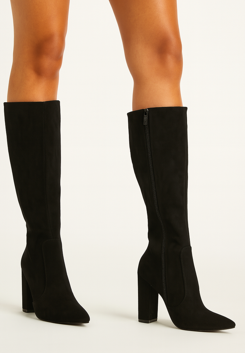 Te zmysłowe, czarne kozaki muszkieterki to kwintesencja jesienno-zimowej elegancji. Wykonane z imitacji zamszu, idealnie dopasowują się do kształtu nogi, podkreślając jej linię. Wygodny, stabilny, gruby obcas zapewnia komfort noszenia przez cały dzień, a nosek w szpic dodaje klasy. Cholewka buta zapewnia idealne dopasowanie. Zapinane na dyskretny zamek błyskawiczny po wewnętrznej stronie, ułatwiają zakładanie. Idealne do sukienek mini, spódnic i obcisłych spodni!