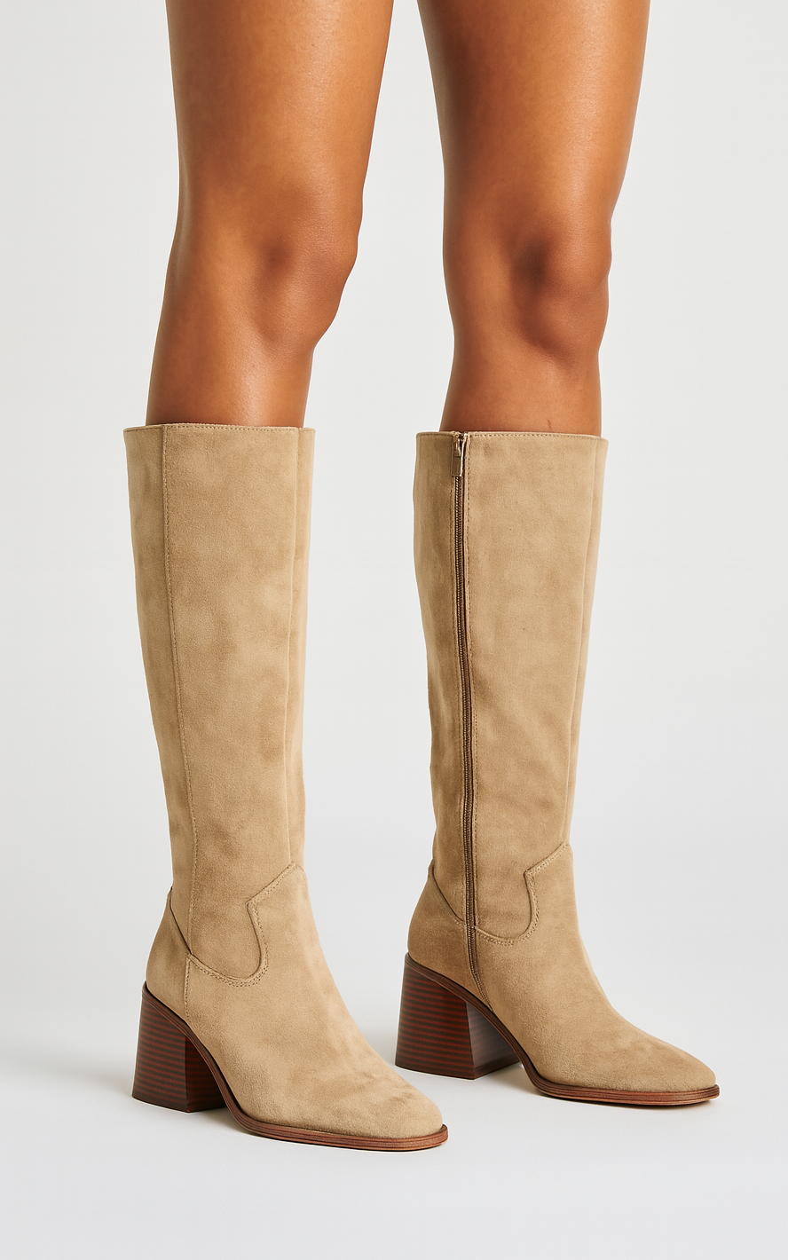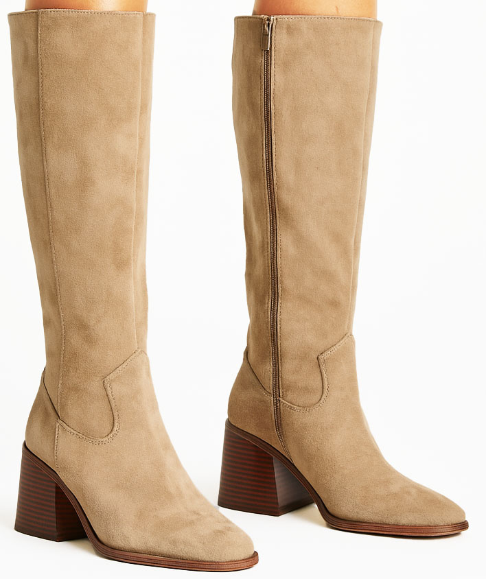 DAMSKIE KHAKI BEŻOWE WYSOKIE KOZAKI ZAMSZOWE NA SŁUPKU