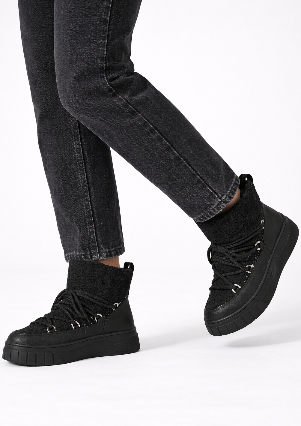Gruba, czarna podeszwa o wyraźnym bieżniku gwarantuje stabilność i doskonałą przyczepność, sprawiając, że buty są idealne zarówno do miejskich spacerów, jak i weekendowych wypadów za miasto.