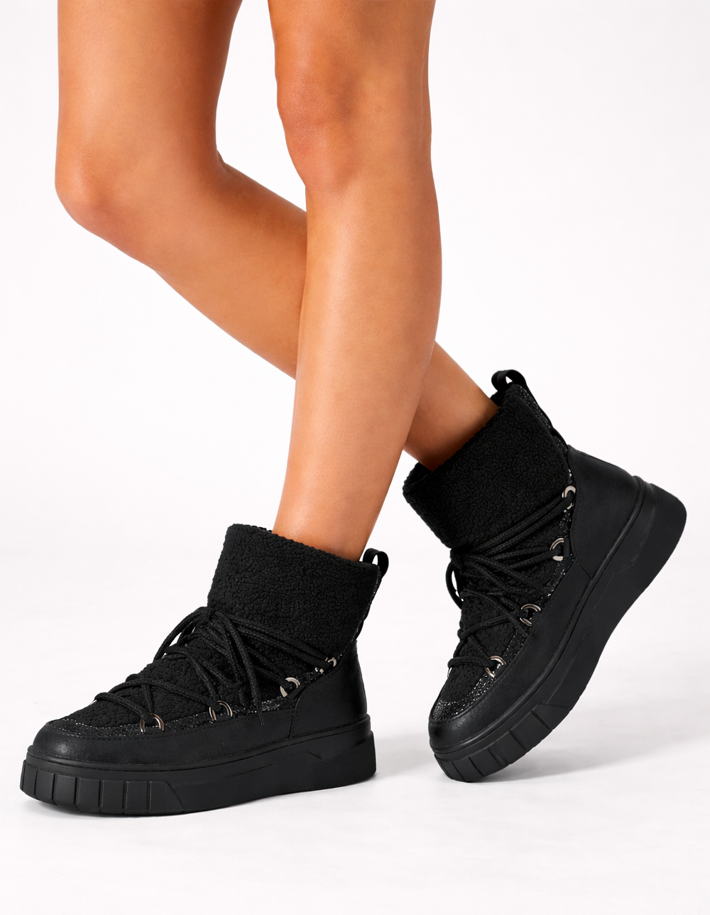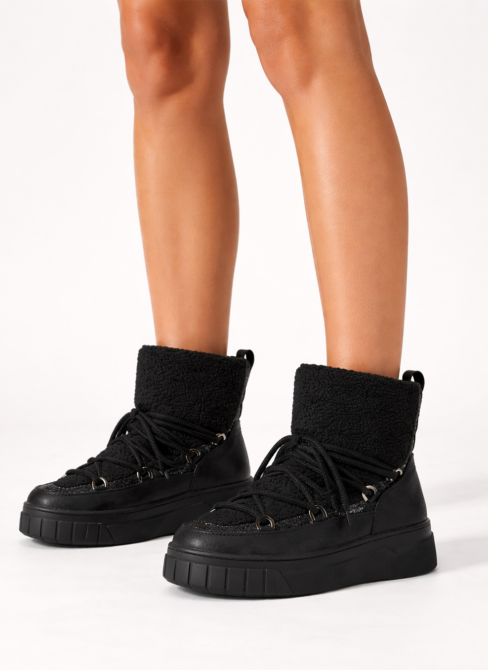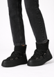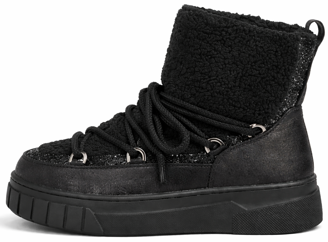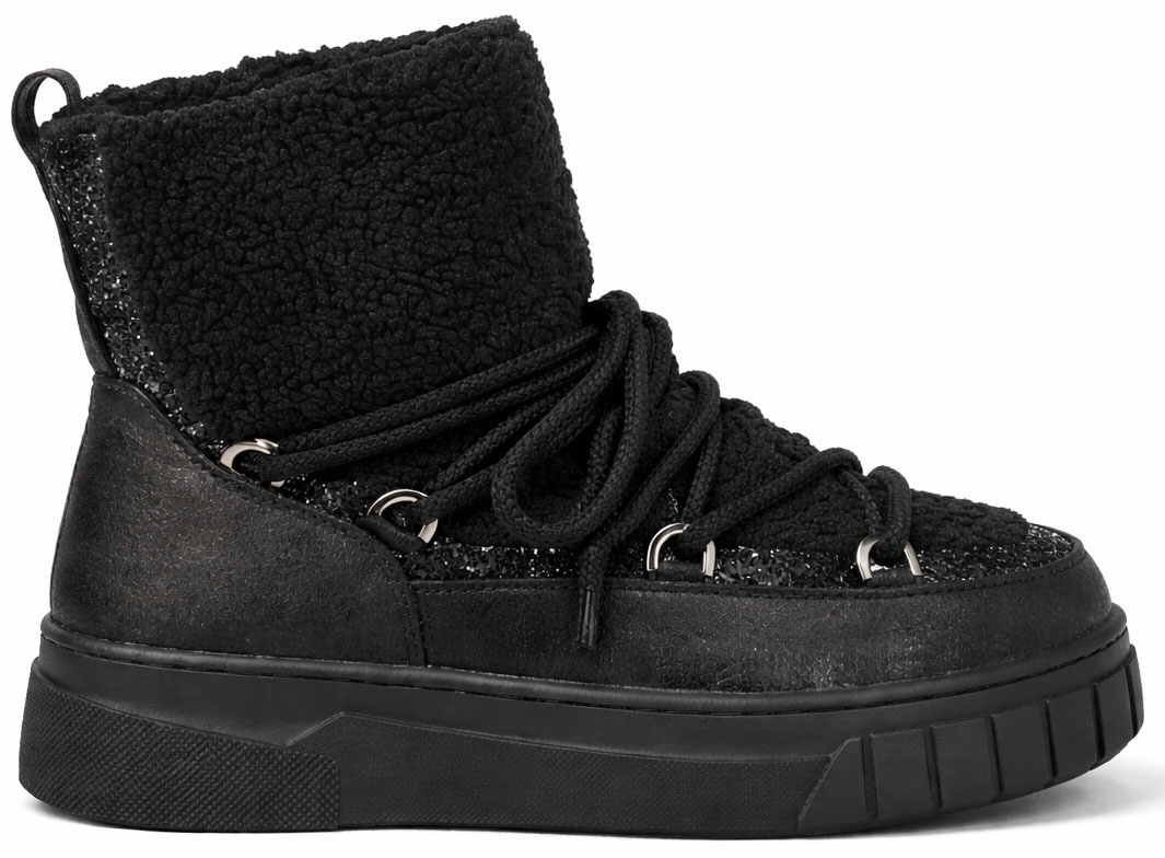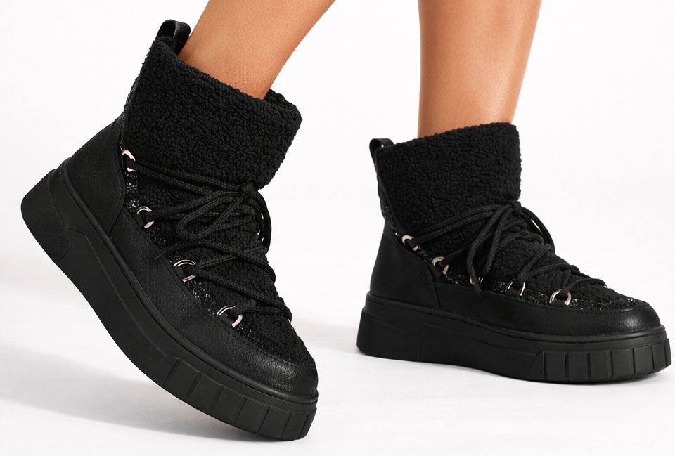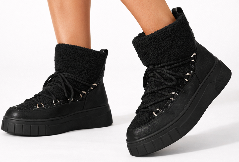 • Wykonane z wysokiej jakości materiałów, wyróżniają się efektownym połączeniem czarnej, lekko połyskującej skóry z miękkim, kożuchem, który zapewnia nie tylko wyjątkowy komfort, ale też ciepło nawet w najzimniejsze dni.